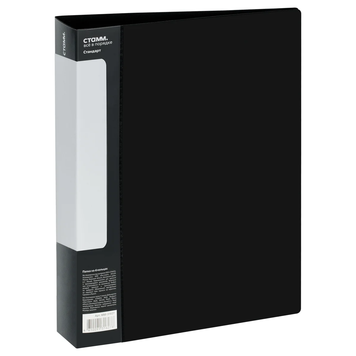 Папка на 4 кольцах «СТАММ» серии «Стандарт» предназначена для хранения перфорированных документов формата А4. Цвет папки — чёрный. Изготовлена из полипропилена толщиной 700 мкм с текстурой «песок». Размер изделия составляет 250*310 мм.