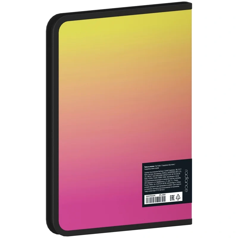 Папка на молнии Berlingo серии Radiance формата А5+ идеальна для хранения и транспортировки документов. Снаружи папка имеет жёлтый/розовый градиент, внутри - чёрный цвет. Изделие размером 245*200*10 мм изготовлено из высококачественного полипропилена толщиной 600 мкм с матовой текстурой поверхности 'песок', на которой не видно отпечатков пальцев и мелких царапин. Папка имеет надежную молнию с мягким ходом.