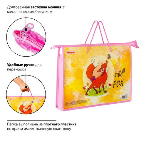 Папка на молнии с ручками ПИФАГОР А4, 1 отделение, пластик, молния сверху, 'FOX', 229114