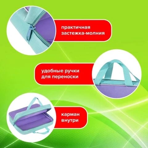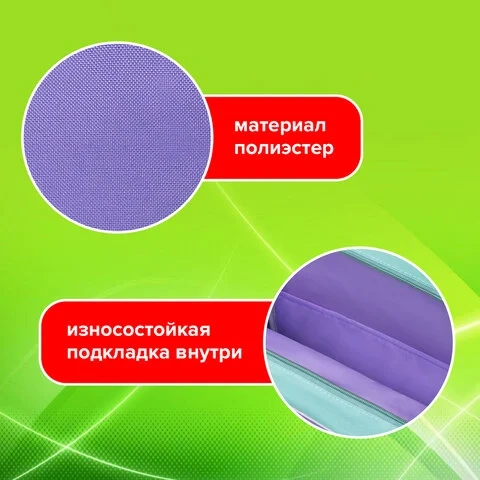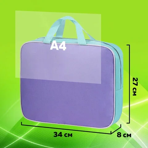 Выполнена из плотного полиэстера, что позволяет защитить документы, учебные пособия и прочие бумаги от замятий и повреждений. Прочные ручки из тесьмы выдерживают нагрузку до 1,5 кг. Швы изнутри дополнительно обработаны тесьмой, что повышает износостойкость и прочность товара. Внутри папки есть карман, который удобно использовать для письменных принадлежностей и других канцтоваров.