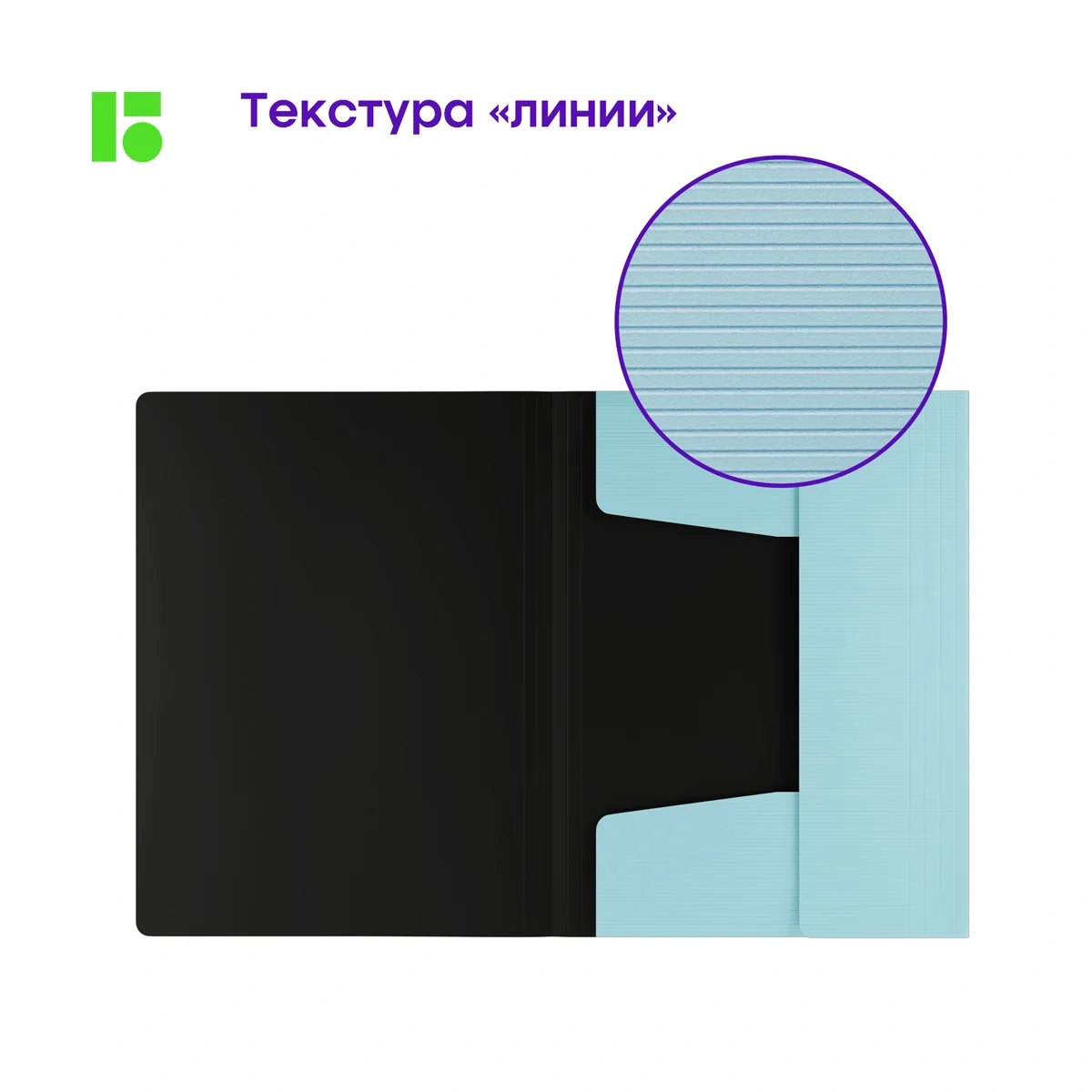 Папка изготовлена из высококачественного полипропилена толщиной 600 мкм с текстурой «горизонтальные линии». Внешняя сторона папки выполнена в насыщенном цвете аквамарин, внутренняя имеет чёрный цвет. Надёжные застёжки-резинки помогают избежать повреждения документов и легко открываются. Упакована в индивидуальный прозрачный пакет по форме.
