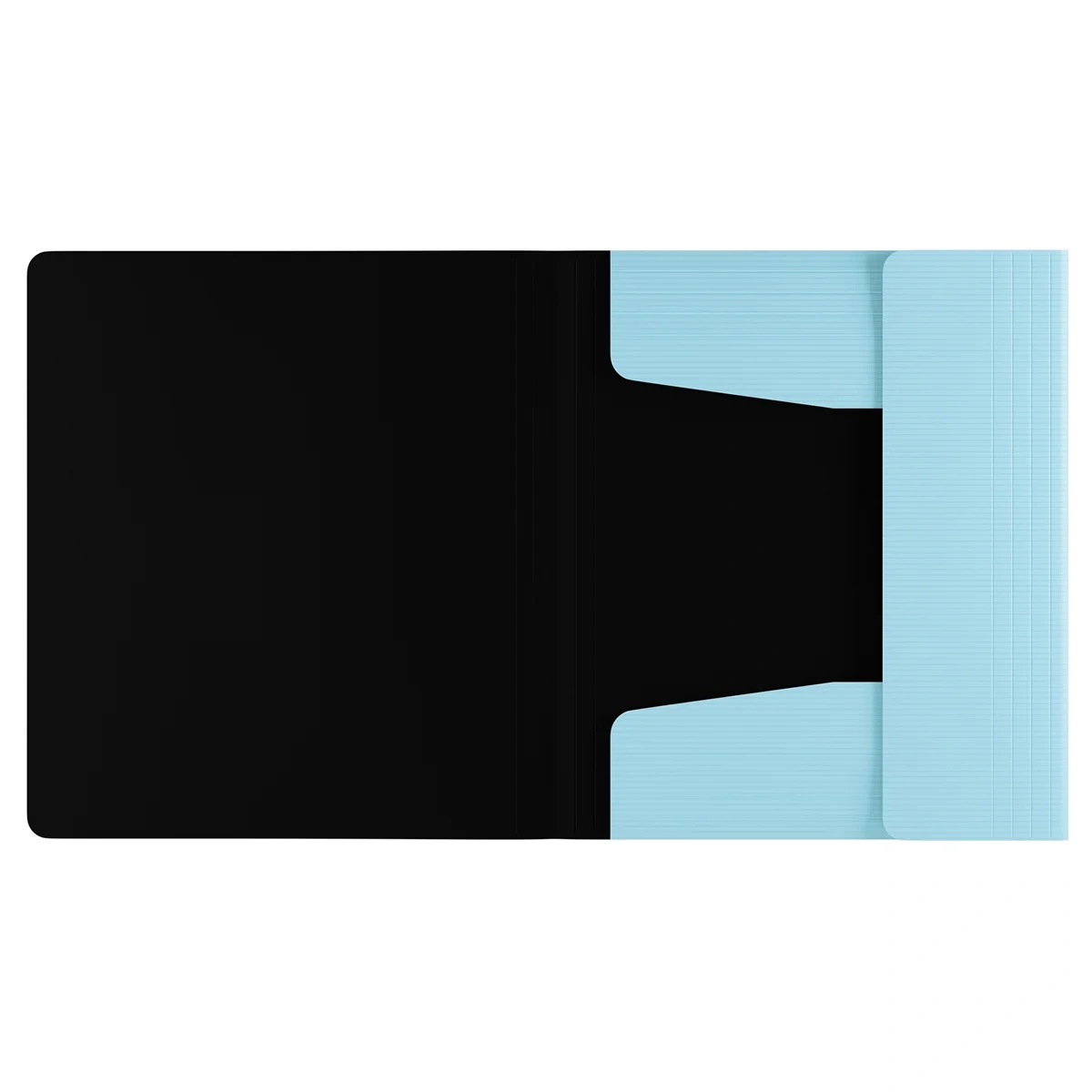 Надежные застежки-резинки. Быстрый доступ к содержимому. Насыщенный пастельный голубой цвет внешней стороны в сочетании с фактурой «горизонтальные линии», чёрный цвет внутренней поверхности. Предназначена для хранения документов. Толщина обложки – 600 мкм. Упакована в индивидуальный прозрачный пакет по форме.