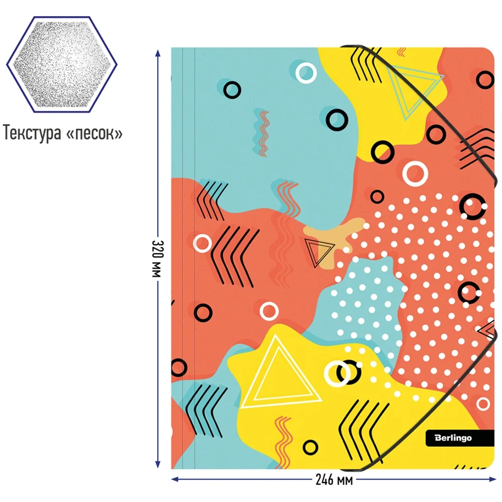 Яркий дизайн коллекционной серии Berlingo Memphis. Белый цвет внутренней поверхности. Надежные застежки-резинки. Быстрый доступ к содержимому. Изготовлена из высококачественного полипропилена с матовой текстурой поверхности «песок», на которой не видно отпечатков пальцев и мелких царапин. Предназначена для хранения документов. Толщина обложки 600 мкм. Упакована в индивидуальный прозрачный пакет по форме.