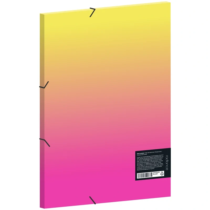 Папка пластиковая на резинках Berlingo серии Radiance формата А4 станет стильным помощником в работе и учёбе. Изделие размером 320*246 мм изготовлено из высококачественного полипропилена толщиной 600 мкм с матовой текстурой поверхности 'песок', на которой не видно отпечатков пальцев и мелких царапин. Папка имеет надежные застежки-резинки чёрного цвета. Мягкие и в то же время прочные резинки обеспечивают быстрый доступ к содержимому. Дизайн изделия с жёлтым/розовым градиентом разнообразит рабочий стол своего владельца.