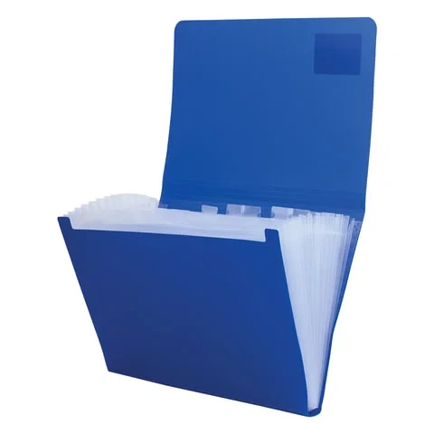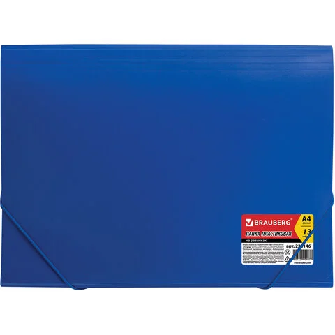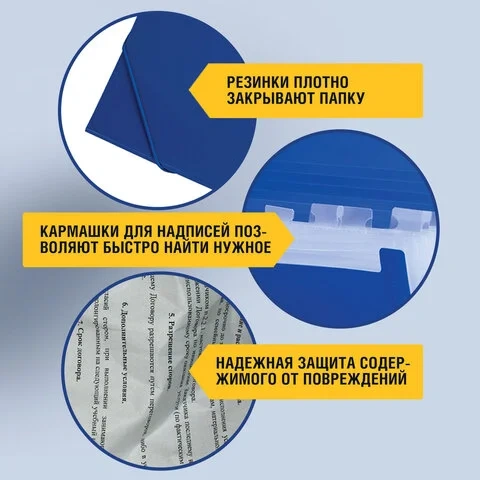 Папка формата А4 изготовлена из качественного пластика толщиной 0,5 мм с матовой фактурой и содержит 13 отделений, которые позволяют структурировать документы. Для удобства поиска нужного документа папка снабжена индексными ярлыками. Резинки, расположенные по углам, плотной закрывают папку, не позволяя содержимому выпасть и надежно защищая от влаги, пыли и прочих механических повреждений. Папка представлена в солидном синем цвете.