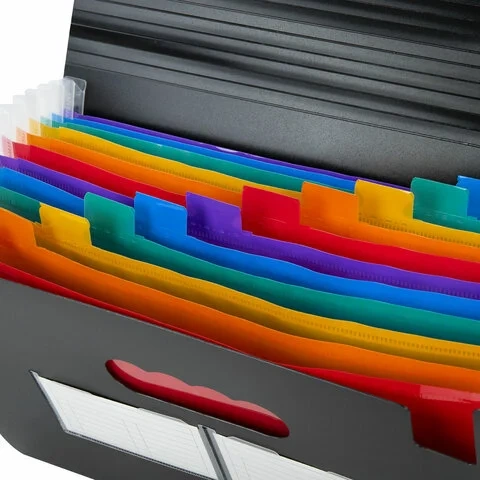 Изготовлена из качественного пластика толщиной 0,8 мм с фактурой под песок. Содержит 13 цветных отделений, которые позволяют структурировать большое количество документов. Для удобства поиска нужного документа разделители снабжены индексными ярлыками. Удобный замок позволяет быстро закрывать и открывать папку, не позволяя содержимому выпасть, и защищая от влаги, пыли и прочих механических повреждений. На лицевой стороне имеются 2 кармана для визиток. Папка представлена в солидном черном цвете.