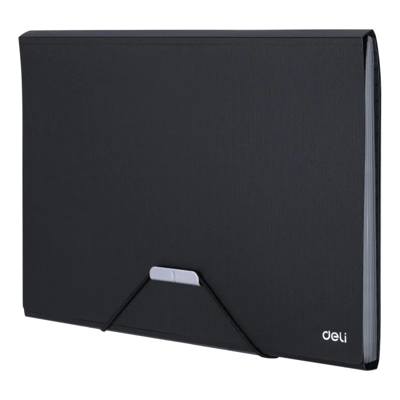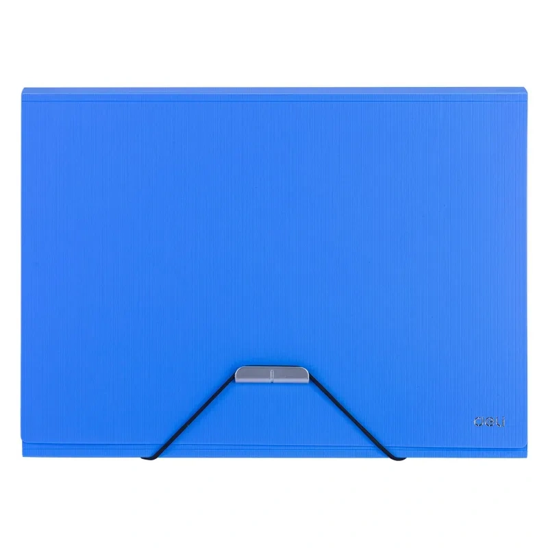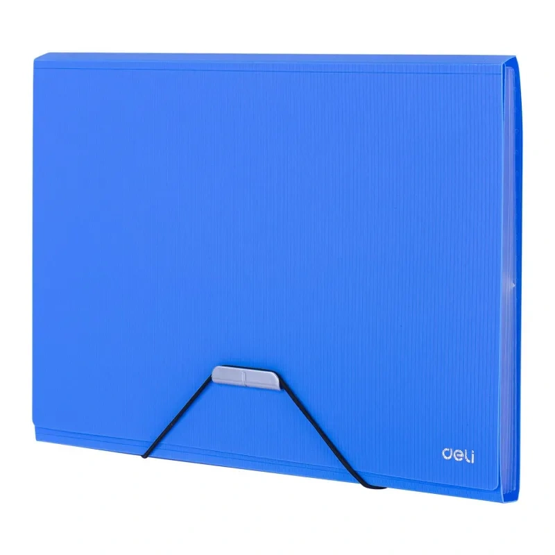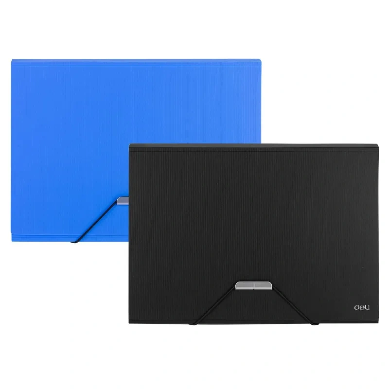 Папка на резинке Deli предназначена для хранения, систематизации и транспортировки документов, тетрадей, чертежей, рисунков, журналов. Папка для канцелярии изготовлена из прочного полипропилена толщиной 0,7 мм. Внутри 7 встроенных карманов гармошек с ярлычком рубрикатора. Долговечный материал имеет хорошую износостойкость, водонепроницаемый. На папке не видно отпечатков пальцев и мелких царапин. На лицевой стороне — два кармана для визиток. Папка вмещает до 200 бумажных листов. Портфель закрывается на удобную и безопасную резинку. Простой и быстрый доступ к бумагам обеспечивает широкое раскрытие папки, а металлический клапан с резинкой надежно удержит документы от выпадения при транспортировке. Папка для документов выполнена в двух тонах: синем, черном. Отличное портативное решение для деловых людей.