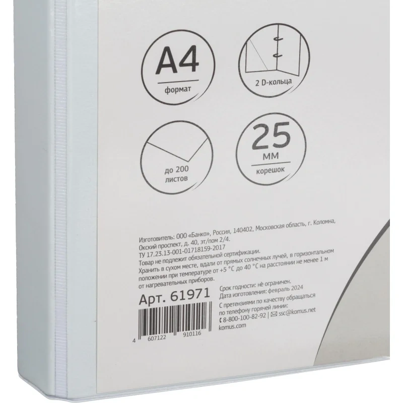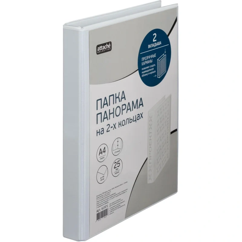 Папка Панорама изготовлена из прочного картона толщиной 1.75 мм, покрытого с двух сторон пленкой ПВХ белого цвета. Формат А4, ориентирован вертикально. Оснащены механизмом на двух D-образных кольцах диаметром 20мм. Вмещают до 200 листов стандартной плотности. Корешок шириной 25 мм имеет прозрачный карман для сменной этикетки.На лицевой и оборотной сторонах папки для презентаций расположены карманы А4 для размещения титульного листа и прочей информации. На внутренней стороне обложки — карман для документов.