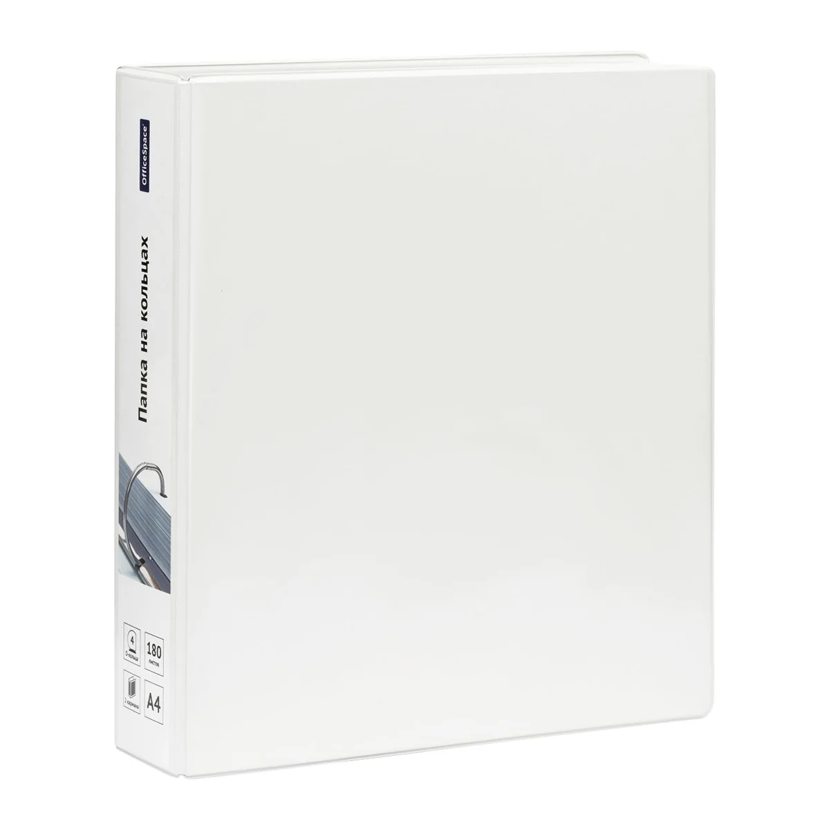 'Папка на 4 кольцах OfficeSpace формата А4 станет идеальным помощником в учёбе и работе. Изделие белого цвета изготовлено из жесткого износостойкого картона с двухсторонним покрытием ПВХ. Папка имеет 2 наружных кармана для создания индивидуальной обложки. Изделие размером 325*280*65 мм идеальна для создания каталогов и презентаций. Имеется карман на внутренней стороне папки. Возможна влажная обработка.
