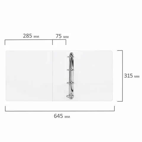 Папка стандартного формата А4 вмещает до 500 листов. Изготовлена из плотного картона с покрытием ПВХ толщиной 2 мм. Лицевая и боковая стороны папки снабжены прозрачными карманами, а на внутренней стороне имеется карман из ПВХ. Ширина корешка составляет 75 мм. Папка оснащена четырьмя кольцами D-образной формы, которые обеспечивают надежное хранение документов. В неё можно вставить файлы или проколотые дыроколом документы. Допускается влажная обработка поверхности. Каждая папка упакована в индивидуальный пакет.