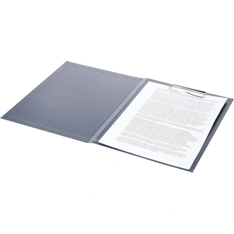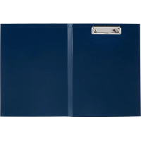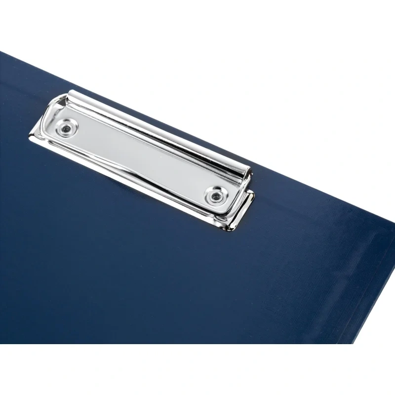 Папка-планшет формата А4 (225×315 мм) изготовлена из плотного картона, сверху покрыт бумвинилом синего цвета. Позволяет комфортно работать с документами на весу. Металлический прижим надёжно удерживает листы и файлы. Вместимость до 75 листов. С крышкой, открывающейся в сторону.