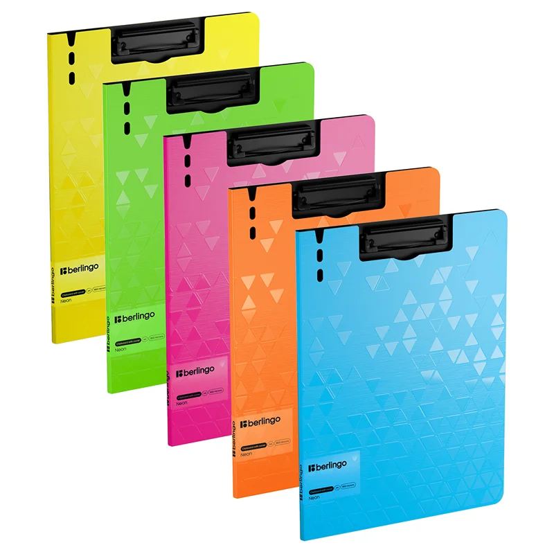 Папка–планшет с зажимом Berlingo серии Neon размером 320*225 мм изготовлена из плотного пластика (полифом) толщиной 1,8 мм. Вместимость папки – 100 листов, ширина корешка – 10 мм. Яркий неоновый цвет внешней стороны сочетается с уникальной фактурой поверхности. Внутренняя поверхность с прижимом выполнена в черном цвете. Черный металлический зажим для фиксации документов. Возможность раскрытия папки на 360 градусов. Вырубки на крышке позволяют легко закрепить ручку на папке. Планшет позволяет делать записи на весу. Индивидуальная упаковка в пакет.