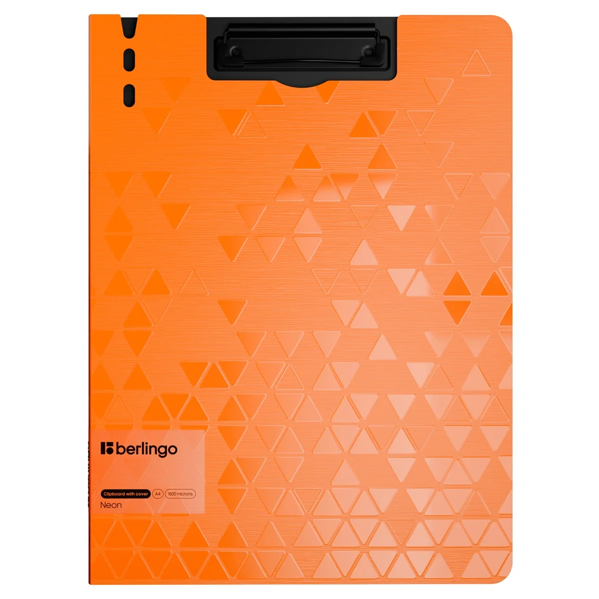 Папка–планшет с зажимом Berlingo серии Neon размером 320*225 мм изготовлена из плотного пластика (полифом) толщиной 1,8 мм. Вместимость папки – 100 листов, ширина корешка – 10 мм. Яркий оранжевый неоновый цвет внешней стороны сочетается с уникальной фактурой поверхности. Внутренняя поверхность с прижимом выполнена в черном цвете. Черный металлический зажим для фиксации документов. Возможность раскрытия папки на 360 градусов. Вырубки на крышке позволяют легко закрепить ручку на папке. Планшет позволяет делать записи на весу. Индивидуальная упаковка в пакет.