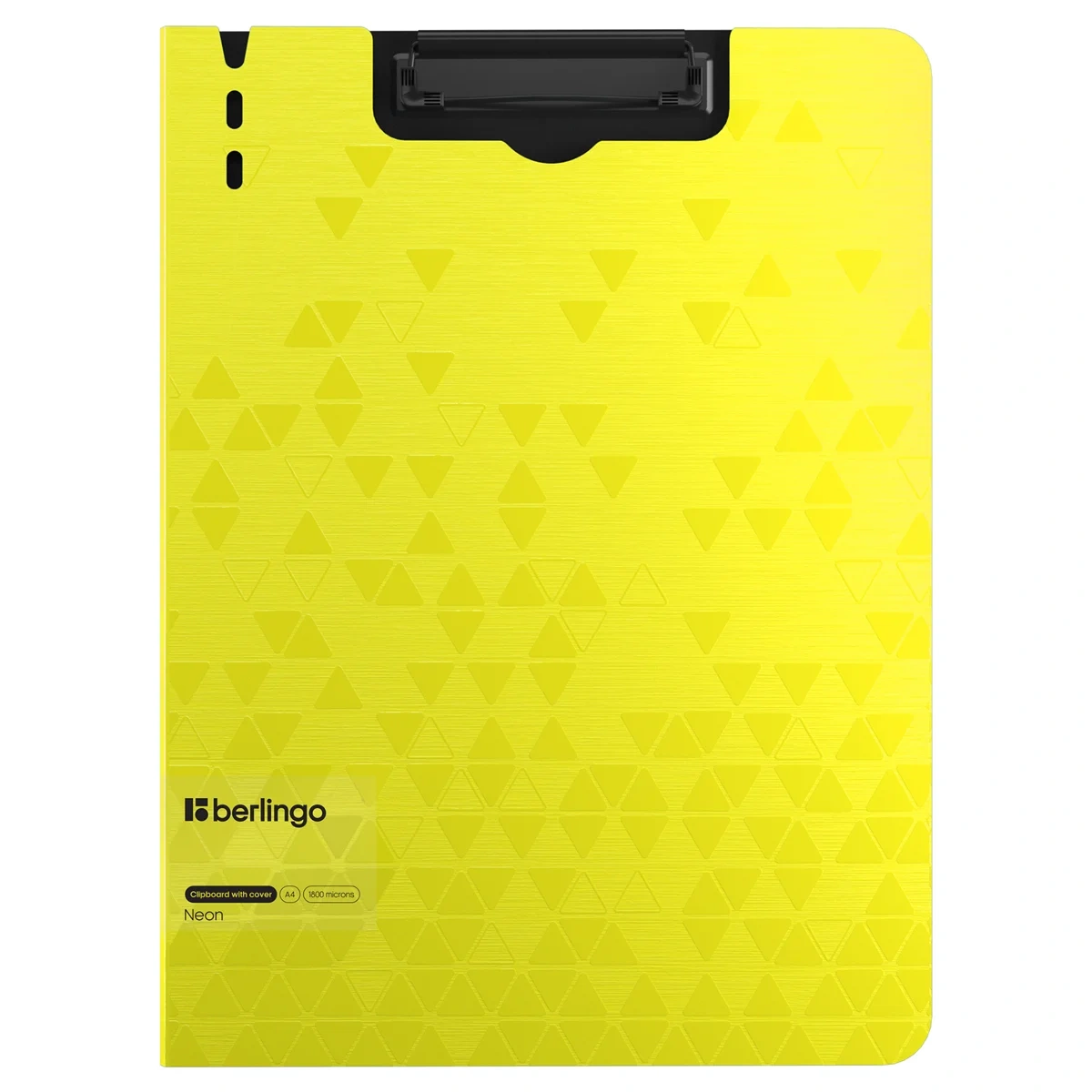 Папка–планшет с зажимом Berlingo серии Neon размером 320*225 мм изготовлена из плотного пластика (полифом) толщиной 1,8 мм. Вместимость папки – 100 листов, ширина корешка – 10 мм. Яркий жёлтый неоновый цвет внешней стороны в сочетании с уникальной фактурой поверхности, черный цвет внутренней поверхности с прижимом. Черный металлический зажим для фиксации документов. Возможность раскрытия папки на 360 градусов. Вырубки на крышке позволяют легко закрепить ручку на папке. Позволяет делать записи на весу. Индивидуальная упаковка в пакет.