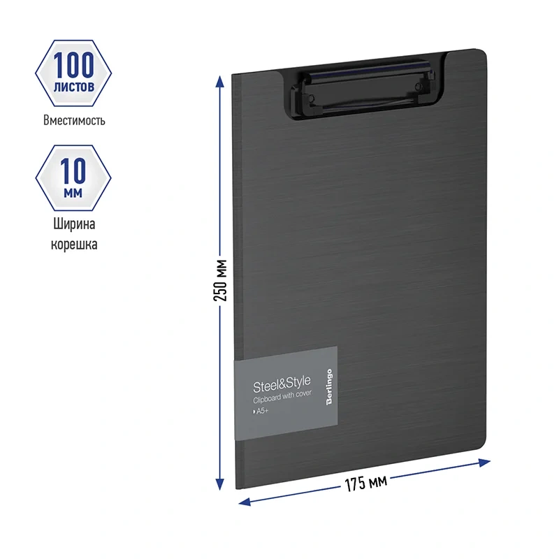 Стильная и удобная папка-планшет с прижимом Berlingo серии Steel&Style формата А5+ позволяет делать записи на весу. Изготовлена из полифома толщиной 1800 мкм. Вмещает до 100 листов. Ширина корешка - 10 мм. Папка-планшет имеет глубокий чёрный цвет внешней стороны в сочетании с фактурой 'сталь' и чёрный цвет внутренней поверхности с чёрным прижимом. Металлический зажим надёжно фиксирует документы, не повреждая их. Размер папки-планшета - 250*175 мм. Упакована в индивидуальный пакет с липким краем.