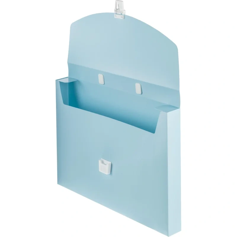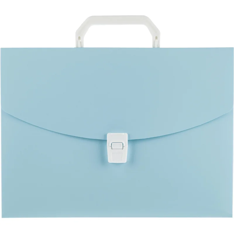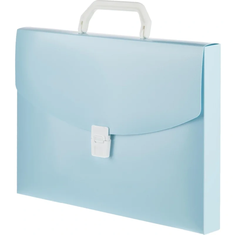 Портфель формата А4 из высококачественного пластика с текстурой поверхности «песок», на которой не видно отпечатков пальцев и мелких царапин. Предназначен для транспортировки документов. Цвет портфеля — голубой коллекция Акварель. Портфель вмещает до 350 бумажных листов. Оснащен замком и ручкой. Размер — 335×230×35 мм, толщина — 0.7 мм.