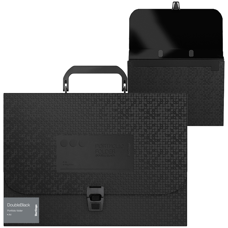 Папка-портфель пластиковая Berlingo 'DoubleBlack' формата А4, черного цвета, с рисунком. С черной ручкой и с надежной защелкой-замком. Черный цвет внутренней поверхности. Быстрый доступ к содержимому. Изготовлена из высококачественного полипропилена с матовой текстурой поверхности 'песок', на которой не видно отпечатков пальцев и мелких царапин. Предназначена для хранения и транспортировки документов. Толщина обложки 1000мкм. Вмещает до 350 листов. Размер 250*335*40. Упакована в индивидуальный прозрачный пакет по форме.