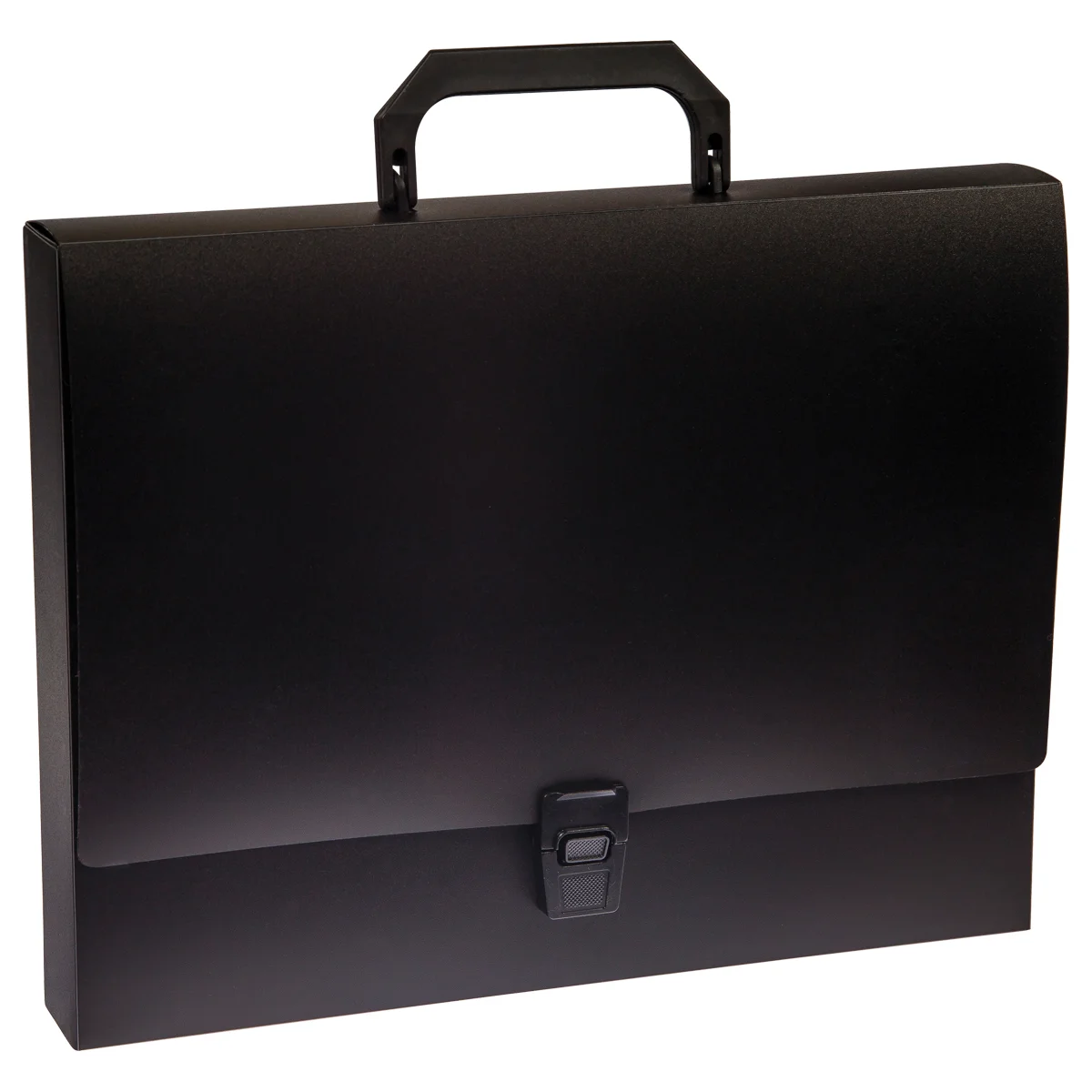 Папка-портфель на замке «СТАММ» формата А4 используется для хранения и перевозки большого количества документов. Размер: 321*248*40 мм, вместимость: 220 листов. Папка изготовлена из качественного пропилена толщиной 600 мкм. Цвет - чёрный. Портфель застегивается на замок, имеет пластиковую ручку чёрного цвета.