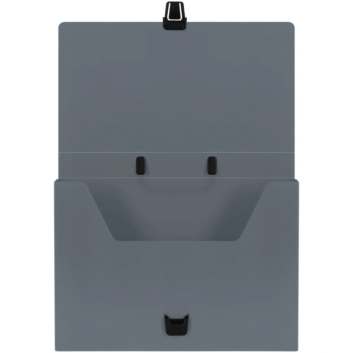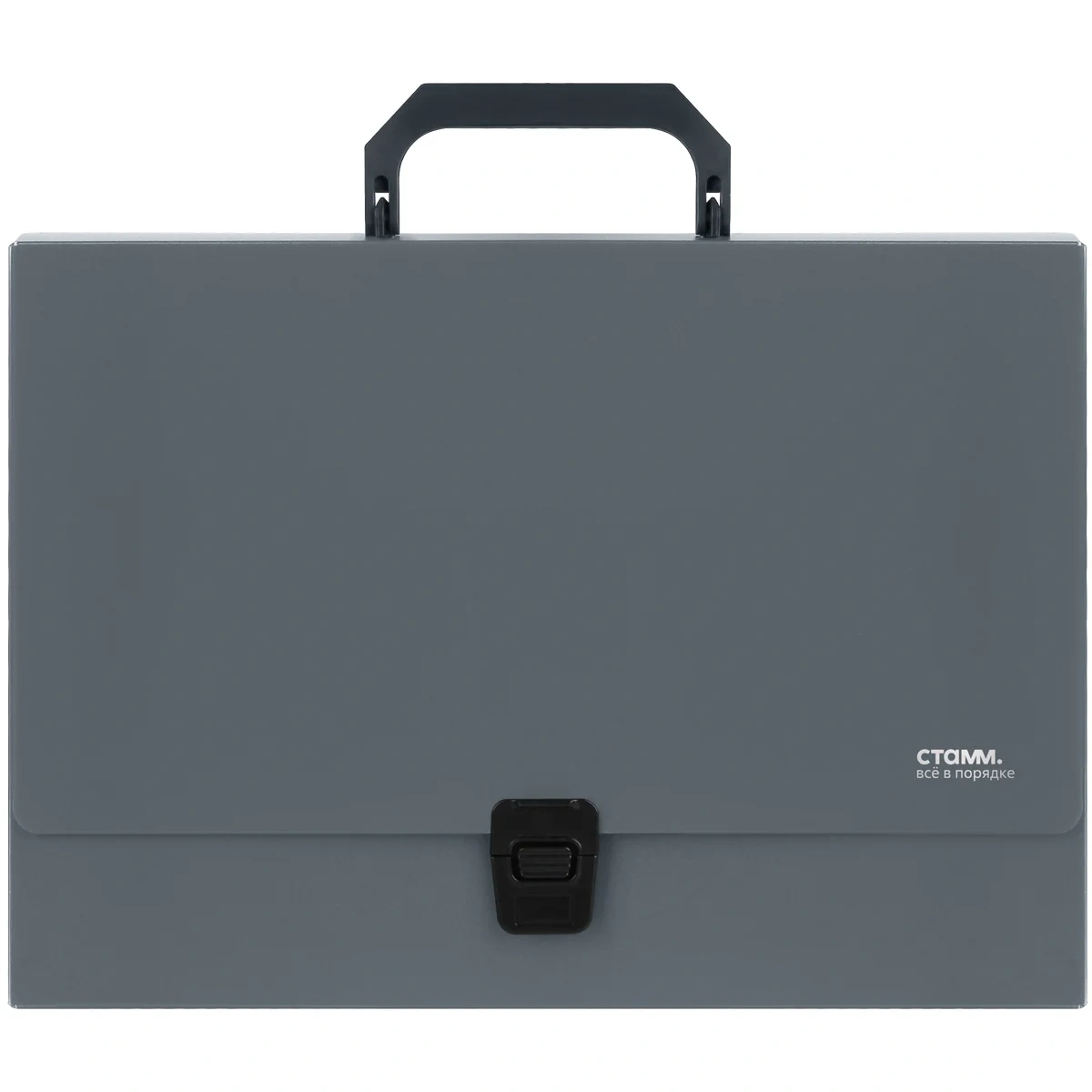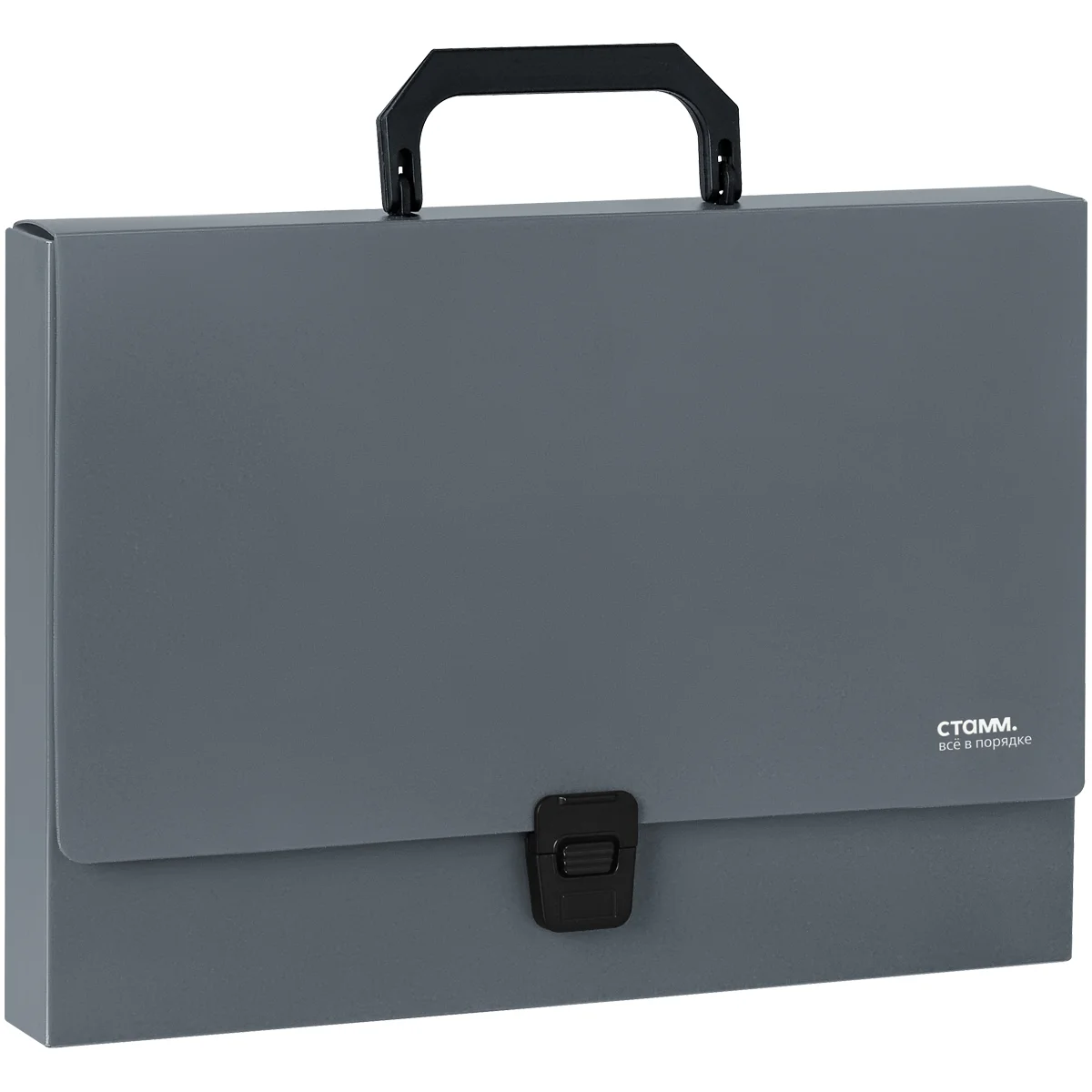 Папка-портфель с одним отделением «СТАММ» предназначена для транспортировки документов и бумаг формата А4. Размер изделия — 321*248*40 мм. Портфель вмещает до 220 листов. Он изготовлен из пластика плотностью 600 мкм. Папка застёгивается на замок, имеет пластиковую ручку чёрного цвета. Папка представлена в классическом офисном сером цвете