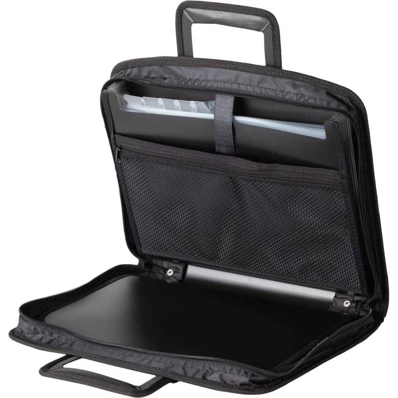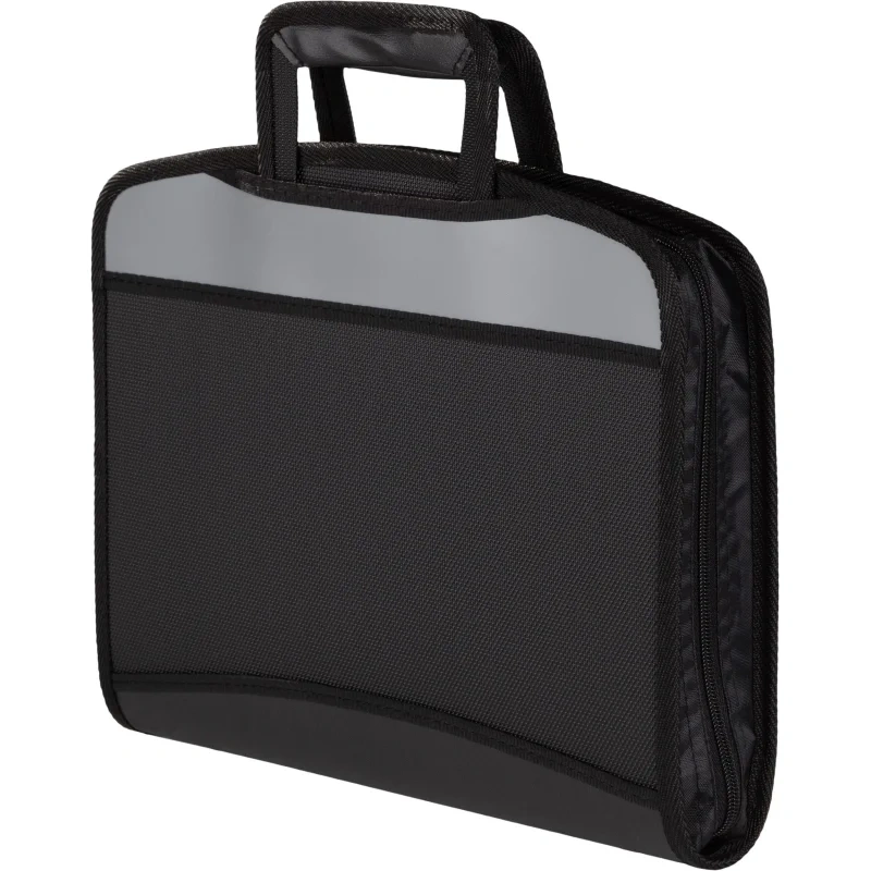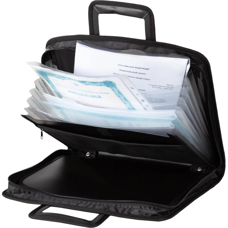 Папка-портфель Attache формата А4+, размер 275×40×350 мм. Изготовлена из прочного пластика черного цвета с серой вставкой. Имеет пять отделений и отделение для мелочей. Застегивается на молнию. Оснащена выдвижными ручками.