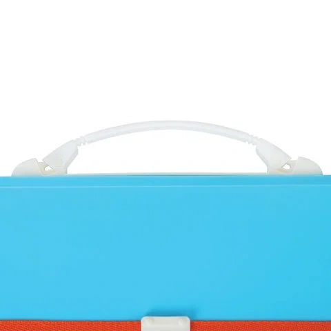Портфель формата А4 (330х245х35 мм) изготовлен из плотного пластика стандартной фактуры толщиной 0,7 мм, выполнен в ярком бирюзовом цвете и имеет 13 отделений с индексными ярлыками. Складная ручка обеспечивает компактность изделия. Портфель застегивается на клапан. Края окантованы тканью с металлическими рейками по краям окантовки, что придает изделию презентабельный вид.