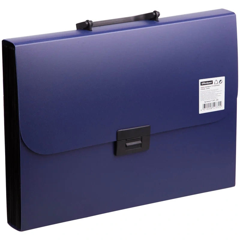 Папка-портфель 13 отделений OfficeSpace, формата A4, изготовлена из пластика толщиной 700мкм, синего цвета. Используется для хранения и перевозки большого количества документов. Портфель застегивается на клапан. Представлен популярными офисными цветами.