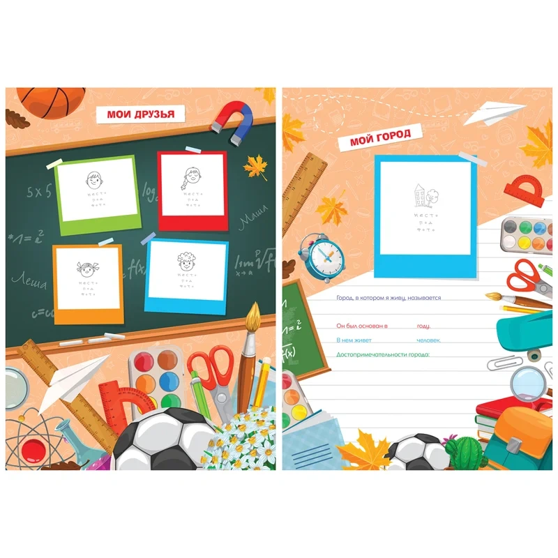 Папка-портфолио для школьника изготовлена из твердого картона. Формат А4. Портфолио имеет кольцевое крепление, с помощью которого крепятся 20 файлов. В нем можно хранить всевозможные грамоты, дипломы, фотографии и другие достижения школьника. Также в комплект входят вкладыши из плотной мелованной бумаги с разделами: 'Это я', 'Моя семья', 'Мои друзья', 'Мой город', 'Моя школа', 'Мой класс', 'Мои оценки', 'Мое творчество', 'Мои достижения' и 'Отзывы и пожелания'.