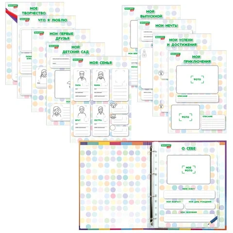 Также в комплект входят 10 вкладышей из плотной мелованной бумаги плотностью 115 г/м2 с разными рубриками: