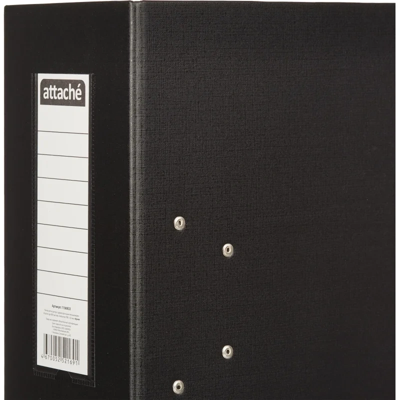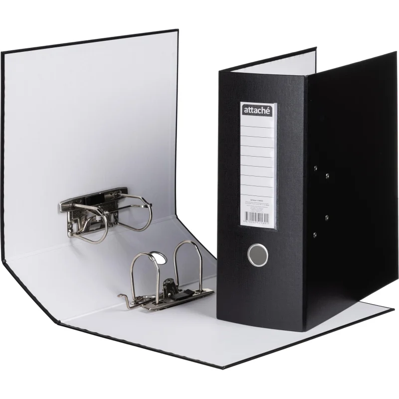 Папка-регистратор Attache с арочным механизмом предназначена для удобного хранения и организации большого количества документов в офисах, учебных заведениях или дома. Формат А4. Изготовлена из плотного картона черного цвета. Внутренняя вклейка бумажная. На корешке увеличенного размера (ширина — 125 мм) есть карман со сменной этикеткой и кольцо для захвата. Большая папка вмещает до 800 листов.