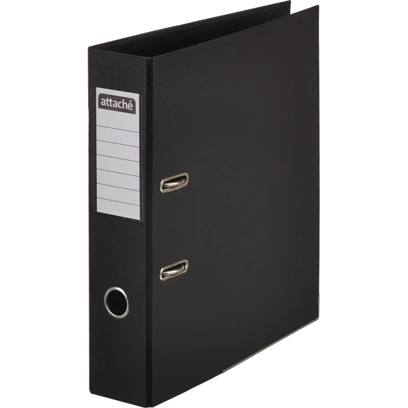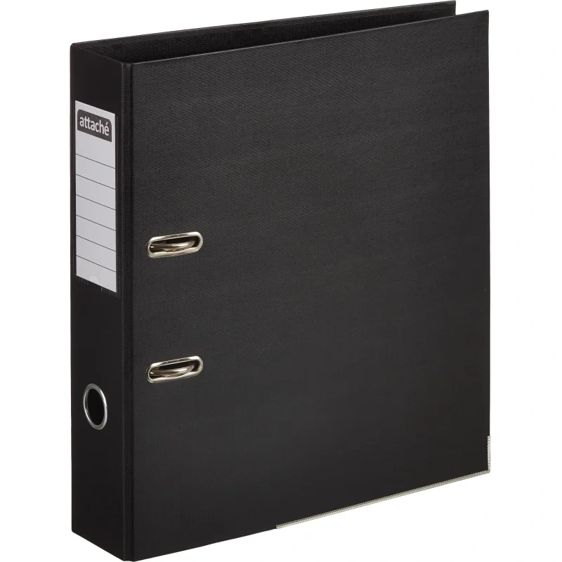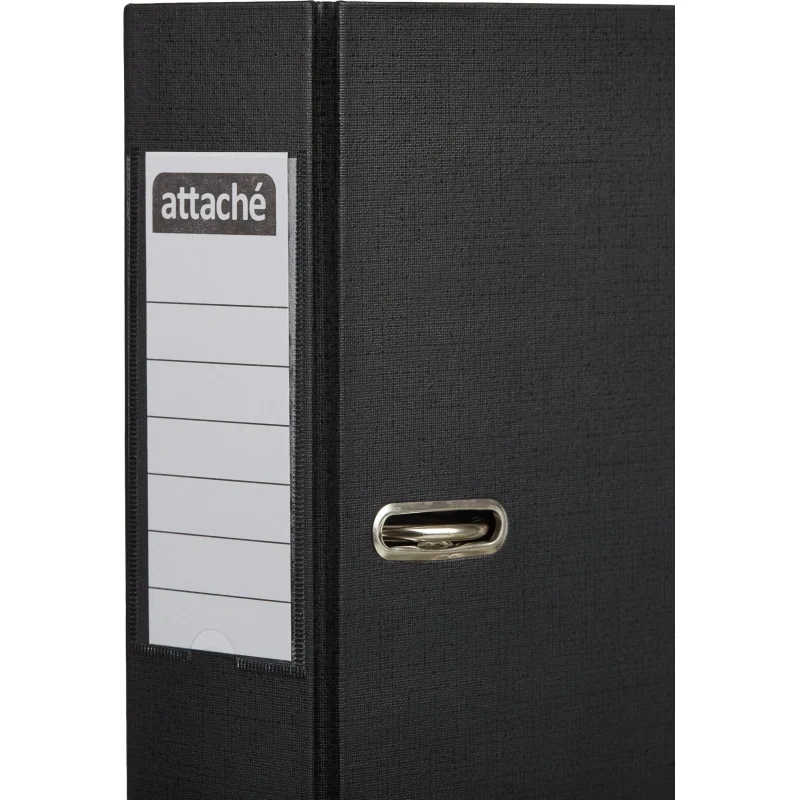 Папка-регистратор Attache А4 75 мм черного цвета изготовлена из картона, внешняя и внутренняя поверхность покрыта бумвинилом (ПВХ). Нижние края защищены от повреждений металлическим кантом. Арочный механизм произведен в Чехии. Папка вмещает 480 листов стандартной плотности формата А4.