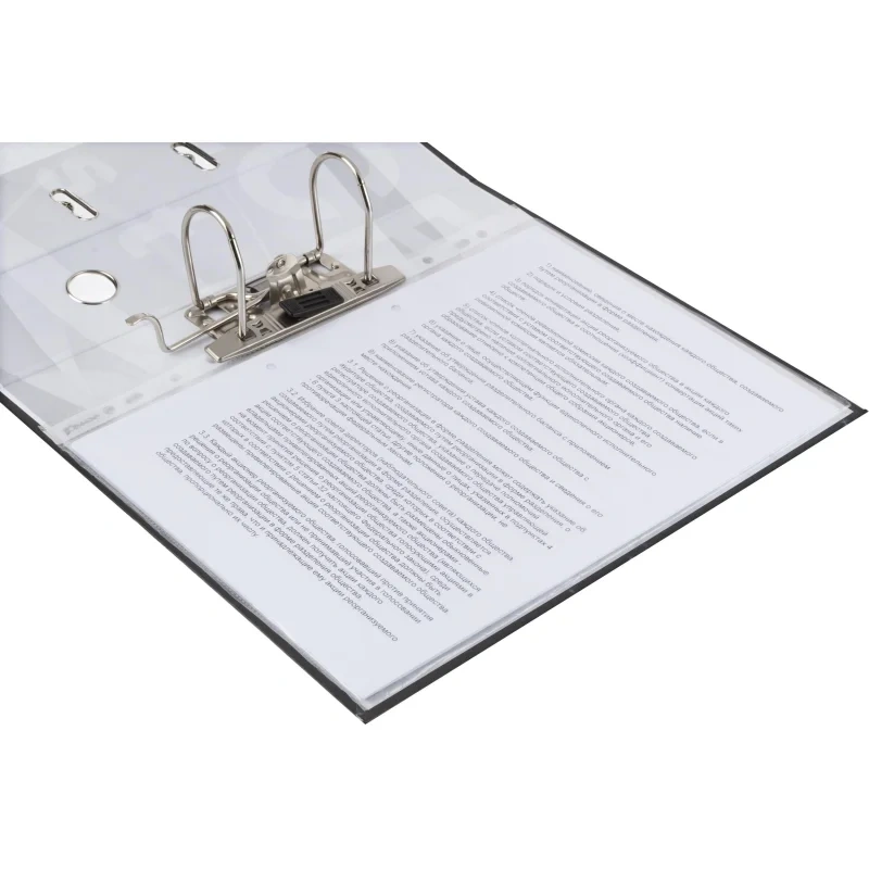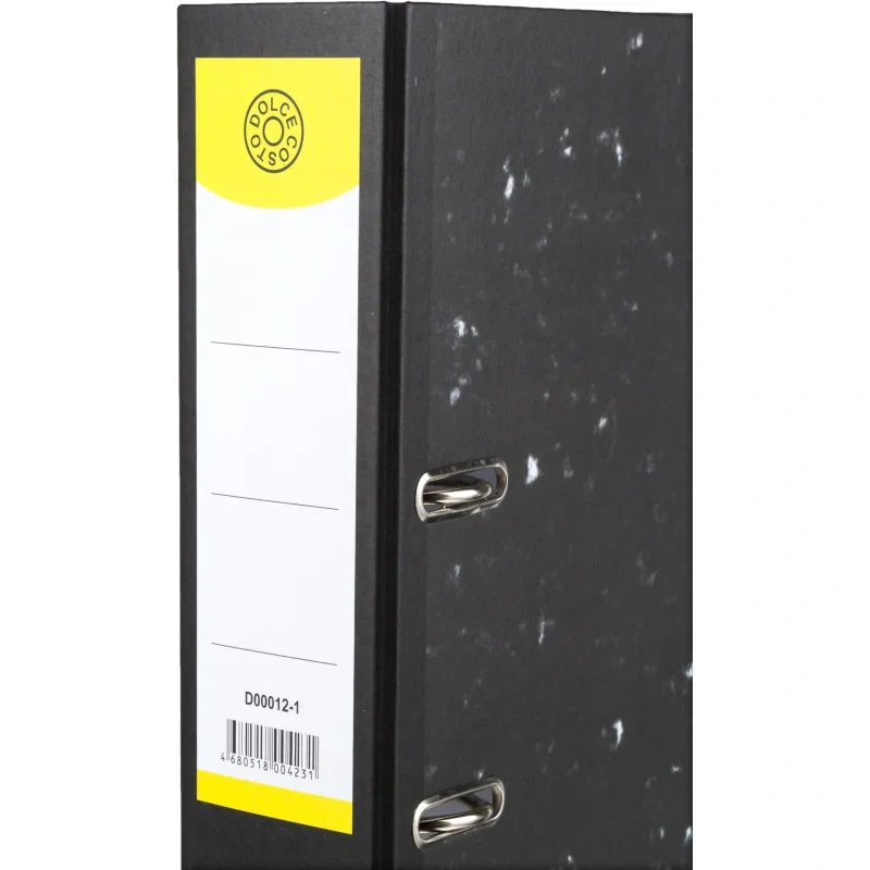 Папка-регистратор 75мм с арочным механизмом изготовлена из плотного картона, с внешней стороны оклеена износостойкой бумагой под «мрамор ». На корешке шириной 75 мм предусмотрено поле для маркировки, на левой внутренней стороне — поле для записи (классификации документов). Прорези на крышке удерживают папку закрытой даже при большом количестве документов. Папка-регистратор вмещает до 480 листов формата А4 стандартной плотности. На торце есть металлическое кольцо для удобства захвата.