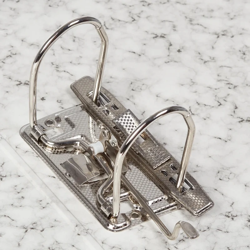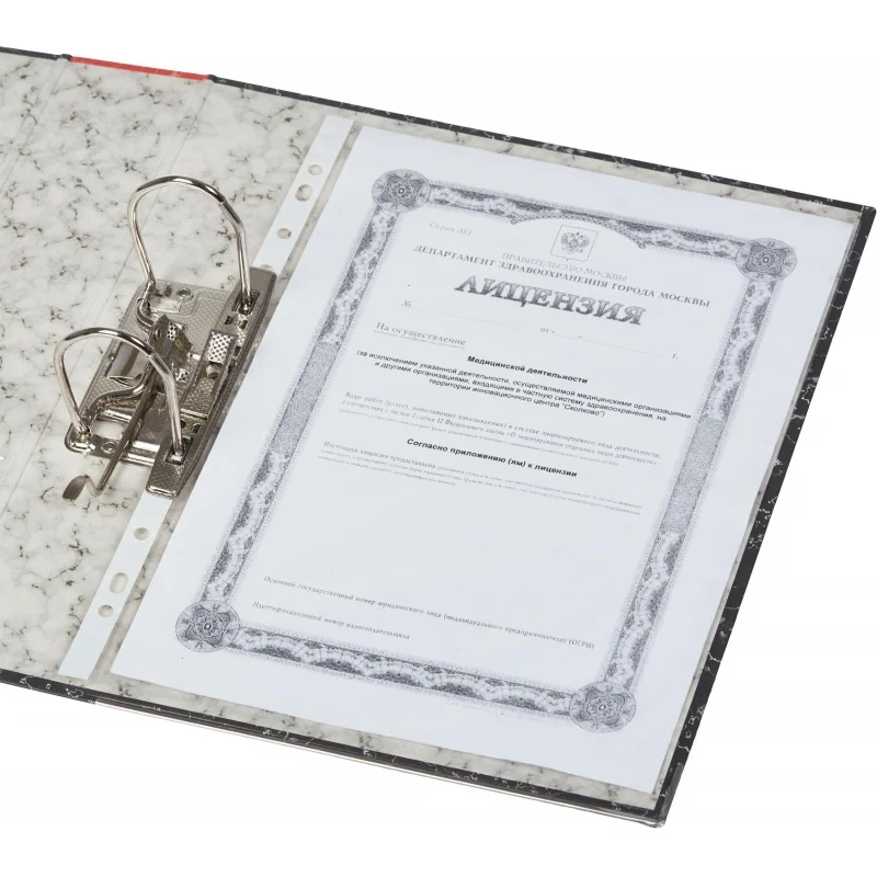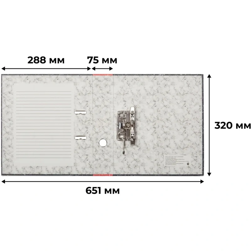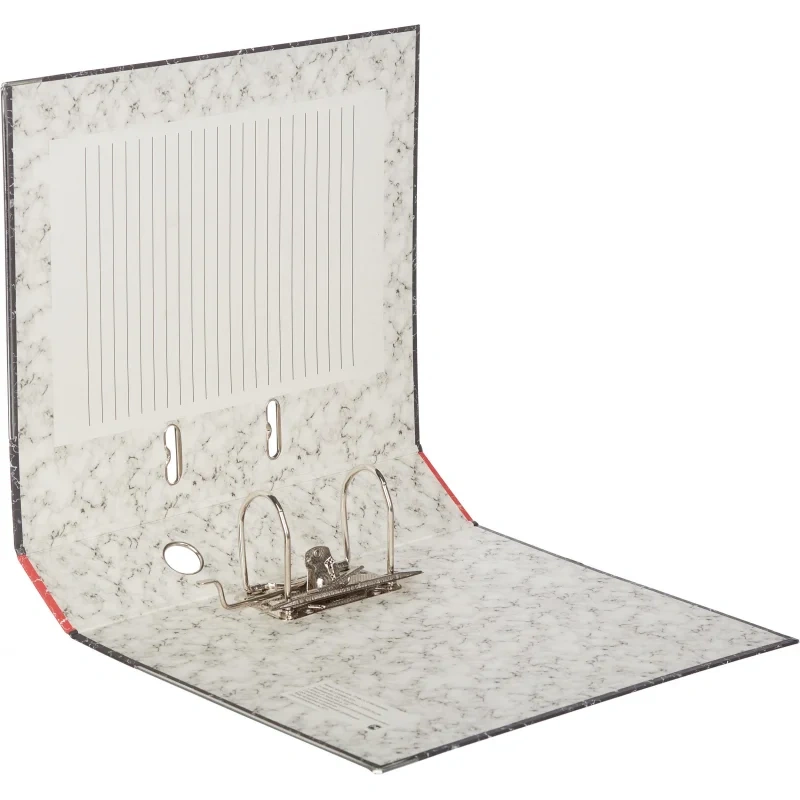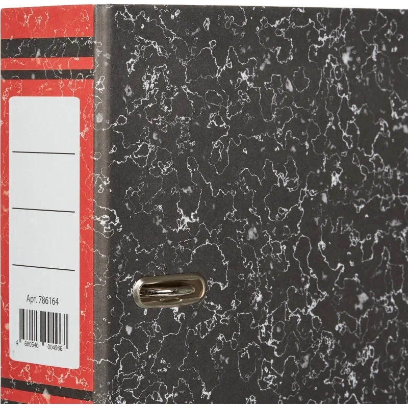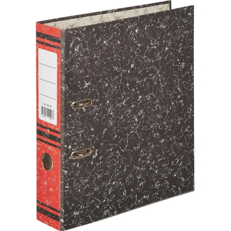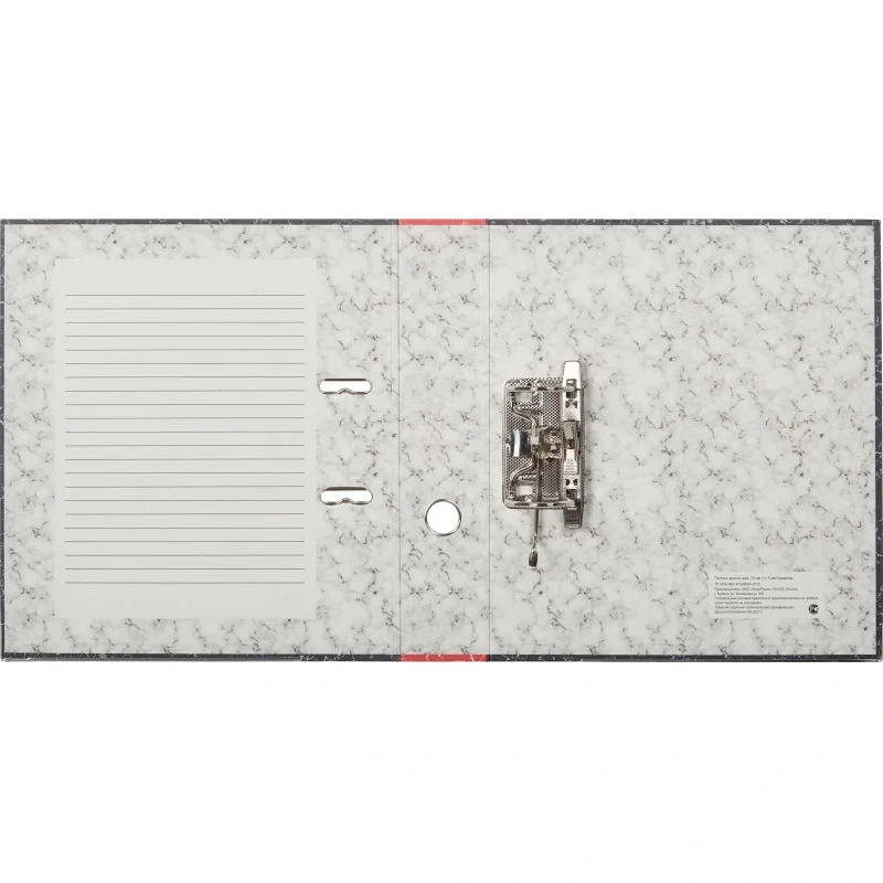 Папка-регистратор с арочным механизмом изготовлена из плотного картона толщиной 2 мм, с внешней стороны оклеена износостойкой бумагой 'под мрамор'. Формат А4. Нижние края защищены металлическим кантом. Прорези на внешней крышке удерживают папку закрытой даже при большом количестве документов. На корешок красного цвета шириной 75 мм наклеена этикетка, есть кольцо для захвата. Папка-регистратор вмещает до 480 листов стандартной плотности. Диаметр кольца - 2,3 мм. Толщина картона - 1, 75 мм. Длина металлического уголка - 230 (+/-0,5 мм).