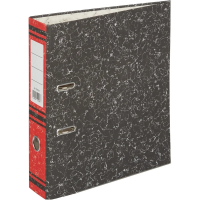 Папка-регистратор с арочным механизмом изготовлена из плотного картона толщиной 2 мм, с внешней стороны оклеена износостойкой бумагой «под мрамор». Формат А4. Нижние края защищены металлическим кантом. Прорези на внешней крышке удерживают папку закрытой даже при большом количестве документов. На корешок желтого цвета шириной 75 мм наклеена этикетка, есть кольцо для захвата. Папка-регистратор вмещает до 480 листов стандартной плотности.