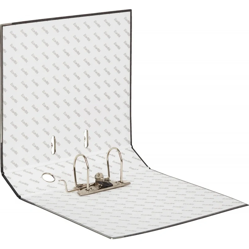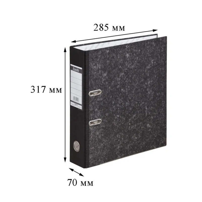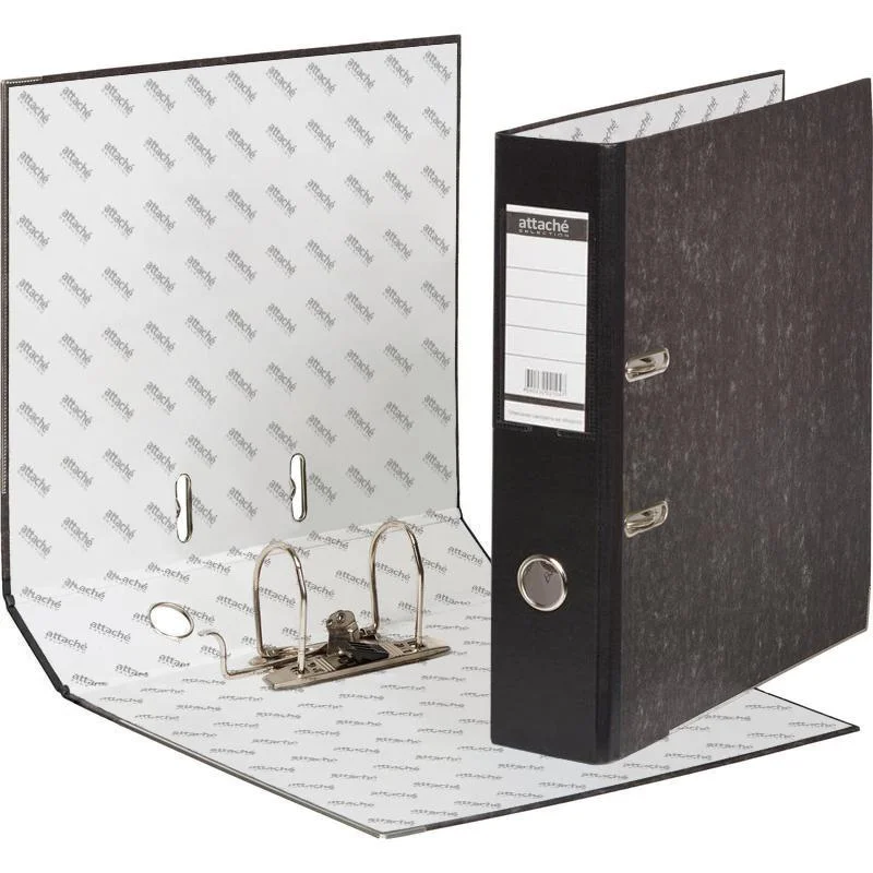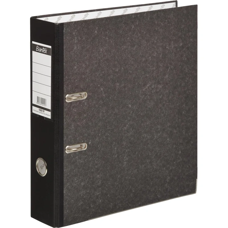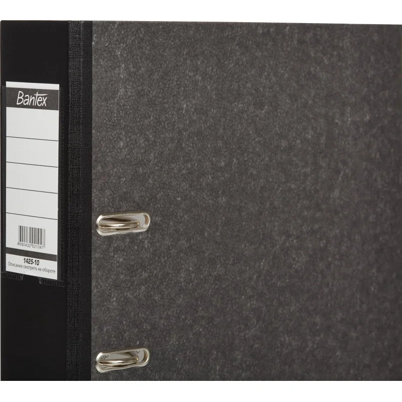 Папка-регистратор Bantex (Attache Selection) изготовлена из прочного картона толщиной 1,9 мм, покрытого с внешней стороны бумагой под мрамор, произведенной в Великобритании, а с внутренней стороны — бумагой с печатью Bantex. На корешке шириной 70 мм, изготовленном из бумвинила, есть карман со сменной этикеткой и круглое кольцо для удобного захвата.