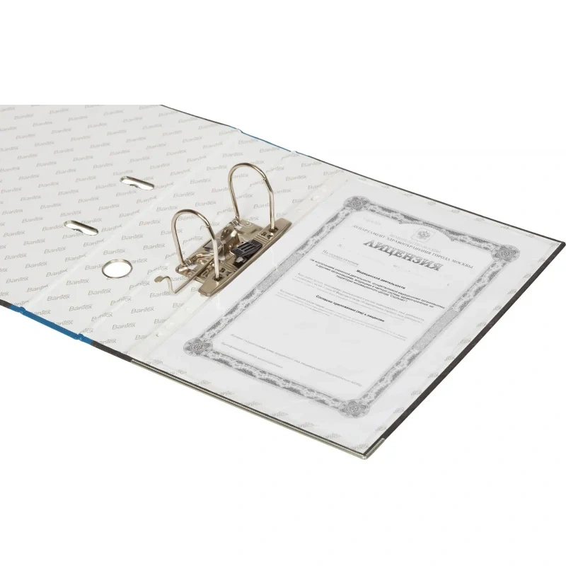 Папка оснащена арочным механизмом, произведенным в Чехии. Вмещает до 480 листов стандартной плотности. Овальные кольца на верхней крышке удерживают папку закрытой даже при большом количестве документов. Нижние края папки защищены металлическим кантом. Цветовая гамма корешка включает 2 цвета.
