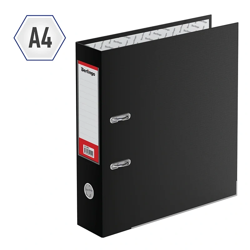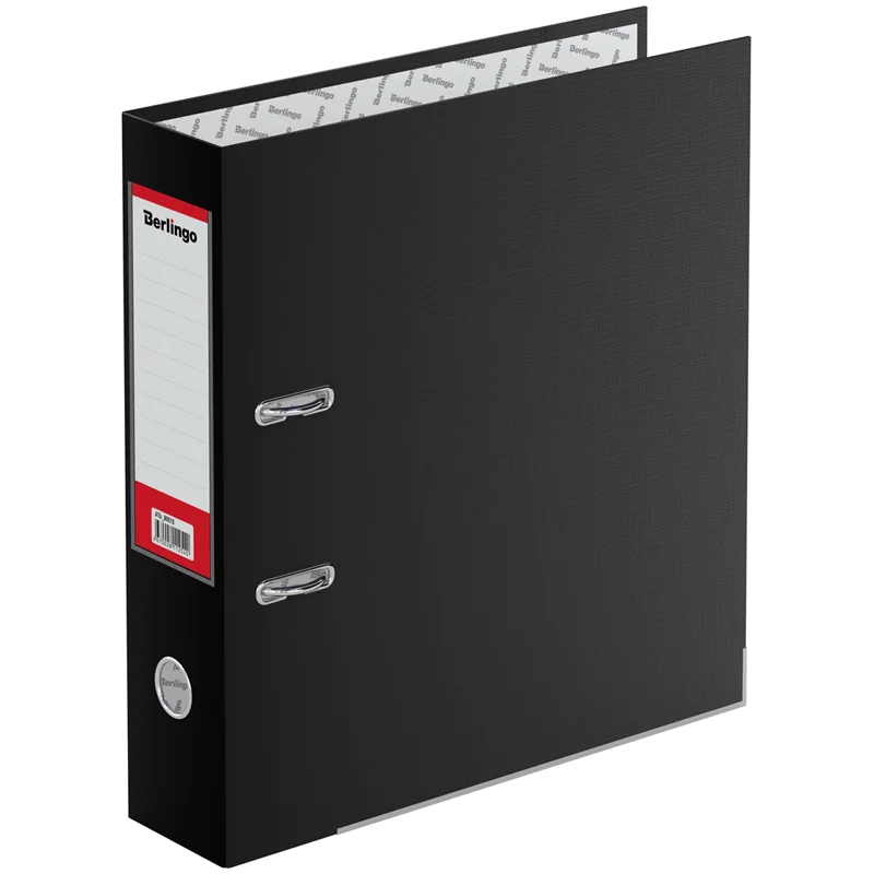 Папка-регистратор Berlingo серии Hyper формата А4 идеальна для создания архива. Папка размером 320*290*80 мм изготовлена из жёсткого износостойкого картона с односторонним покрытием из качественного бумвинила чёрного цвета. Папка эффективно экономит офисное пространство. Ширина корешка составляет 80 мм. Конструкция разработана с учётом всех особенностей эксплуатации. Выгодно отличается надёжным арочным механизмом из качественного металла, наличием кармана на корешке со сменным информационным ярлыком для маркировки, полем для записей на внутренней стороне обложки, отверстием для удобного снятия папки с полки. Для повышения износостойкости нижние грани укреплены металлическим кантом.