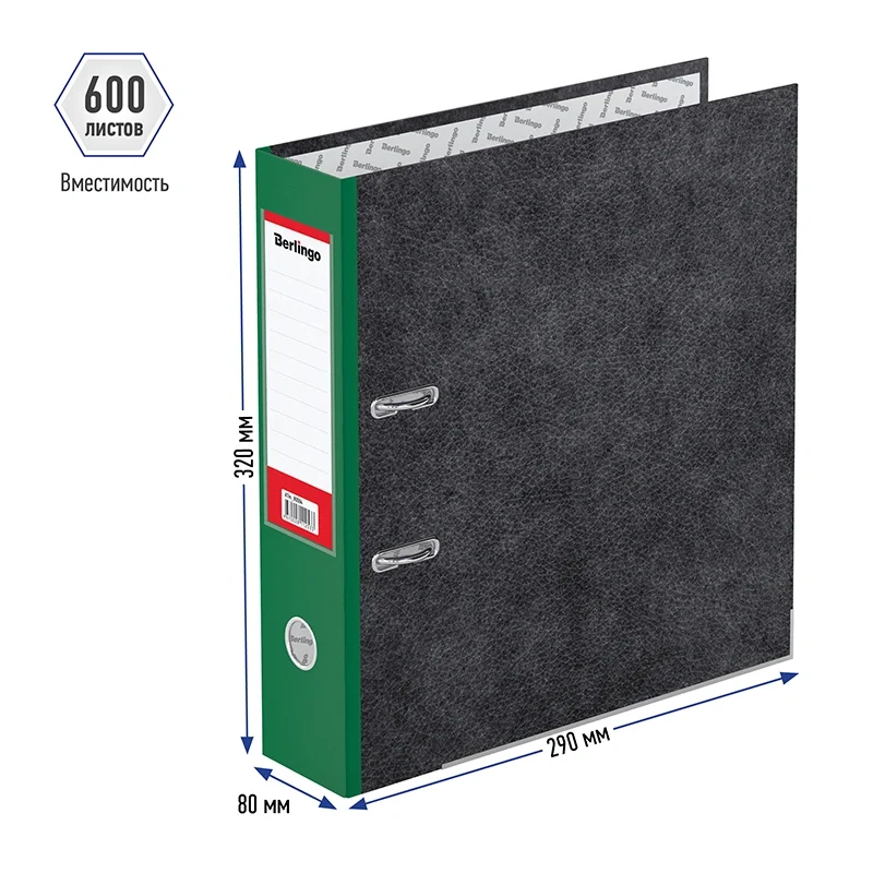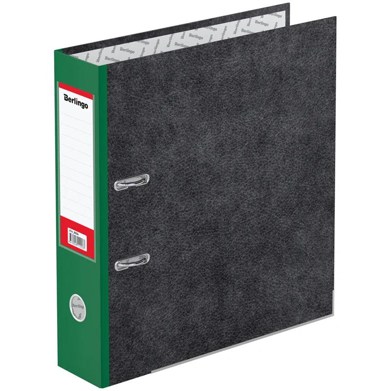 Папка-регистратор Berlingo серии Hyper формата А4 идеальна для создания архива. Папка размером 320*290*80 мм изготовлена из жёсткого износостойкого картона с односторонним покрытием из специальной ламинированной бумаги «под мрамор» и зелёным корешком. Папка эффективно экономит офисное пространство. Ширина корешка составляет 80 мм. Конструкция разработана с учётом всех особенностей эксплуатации. Выгодно отличается надёжным арочным механизмом из качественного металла, наличием кармана на корешке со сменным информационным ярлыком для маркировки, полем для записей на внутренней стороне обложки, отверстием для удобного снятия папки с полки. Для повышения износостойкости нижние грани укреплены металлическим кантом.