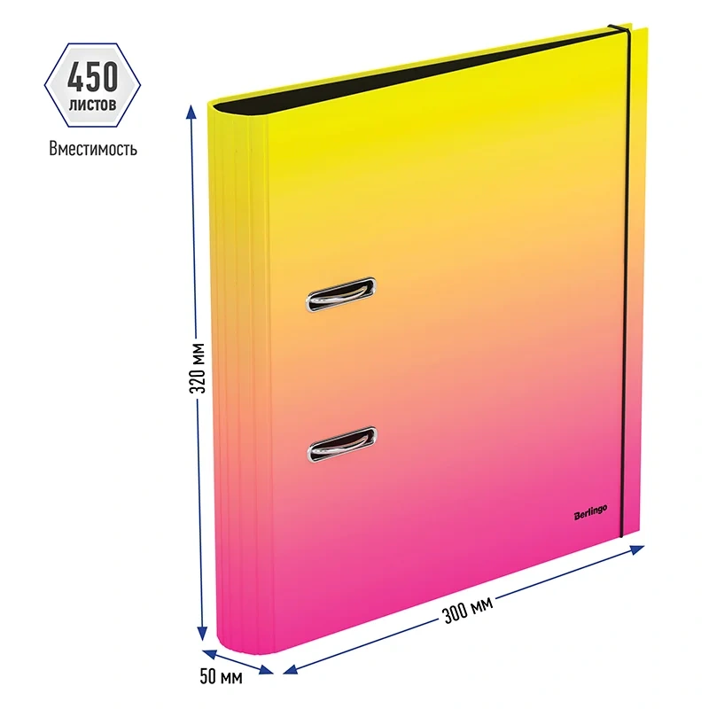 Папка-регистратор Berlingo серии Radiance формата А4 идеальна для создания архива. Папка размером 320*300*50 мм изготовлена из жёсткого износостойкого картона с покрытием из матовой ламинированной бумаги с жёлтым/розовым градиентом. Стильное цветовое решение выгодно отличает изделие. Ширина корешка составляет 50 мм. Конструкция разработана с учётом всех особенностей эксплуатации. Эргономичный закругленный корешок, дополнительная фиксация на резинку, надёжный арочный механизм из качественного металла. Эффективно экономит офисное пространство, идеальна для создания архива.