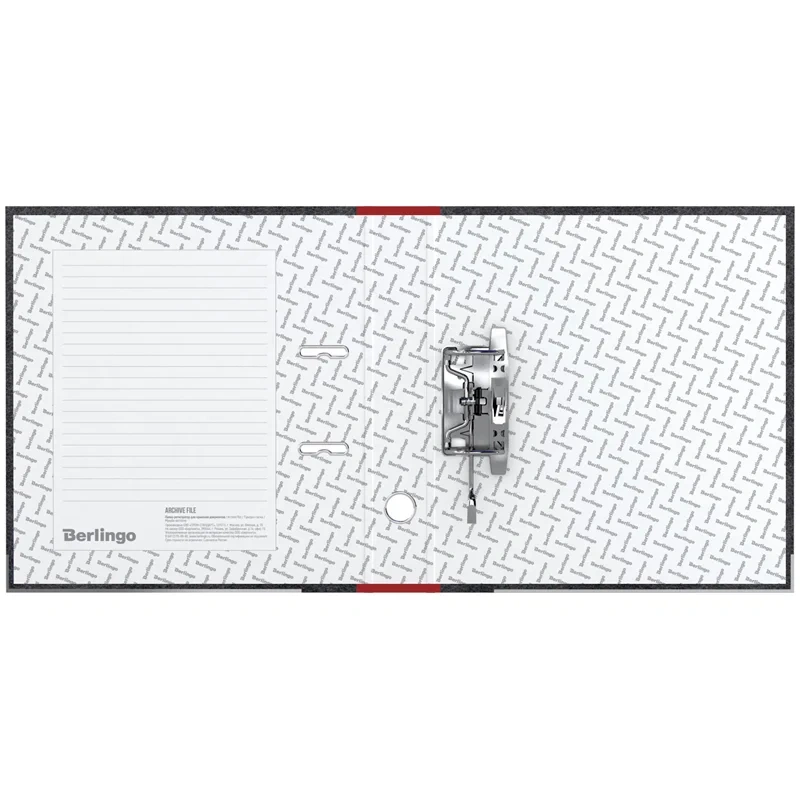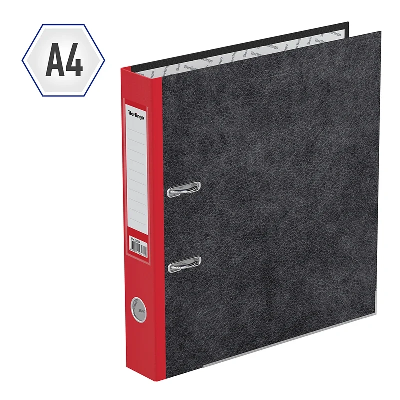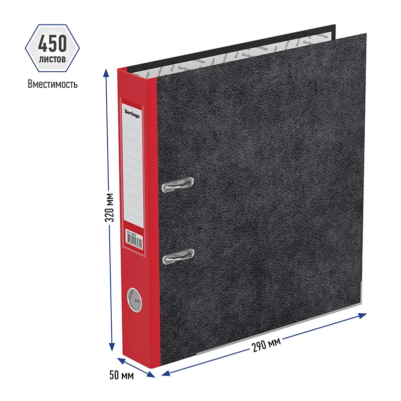 Папка-регистратор Berlingo серии Standard формата А4 с арочным механизмом идеальна для создания архива и экономии офисного пространства. Папка вмещает до 450 листов. Ширина корешка составляет 50 мм. Минималистичный и стильный дизайн: внешнее покрытие 'мрамор' чёрного цвета прекрасно сочетается с красным корешком, а на нижней грани есть металлическая окантовка. Изготовлена из жёсткого износостойкого картона. Папка имеет арочный механизм из качественного металла. Конструкция разработана с учётом всех особенностей эксплуатации. Эргономичное отверстие в корешке помогает быстро снять папку с полки. На корешке папки есть карман со сменным информационным ярлыком для маркировки. На внутренней стороне обложки папка-регистратор имеет поле для записи. Размер папки – 320*290*50 мм. Ориентация папки - вертикальная.