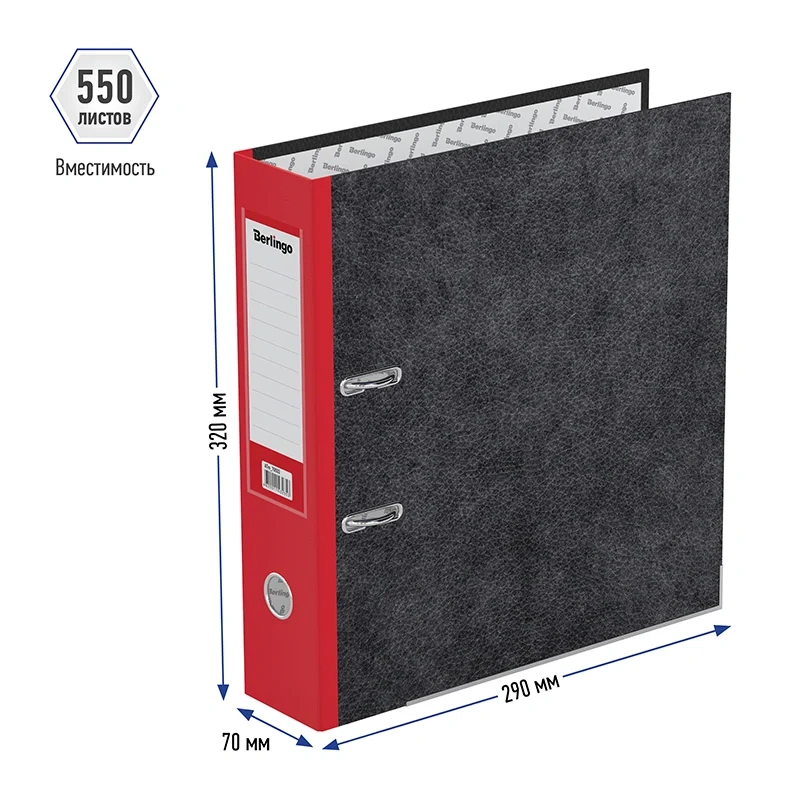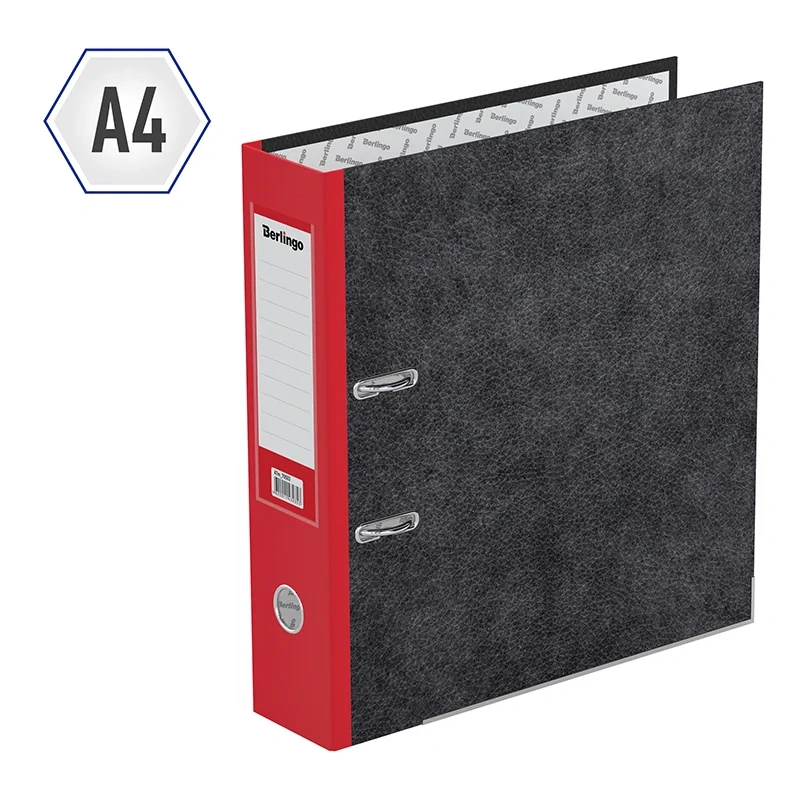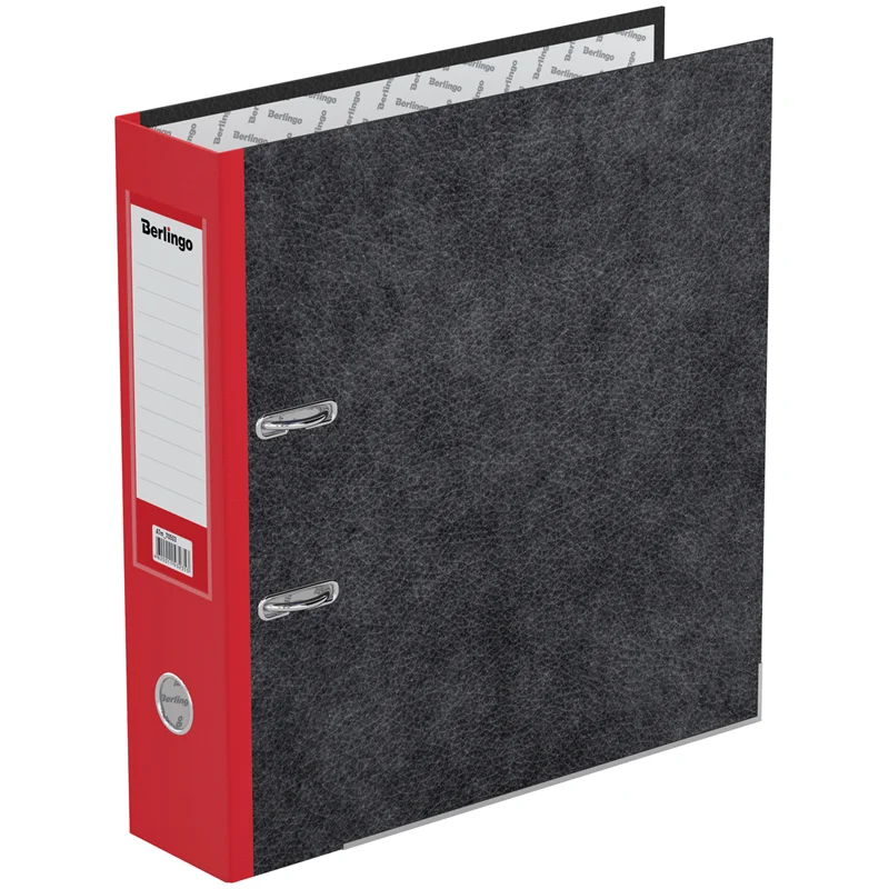Папка-регистратор Berlingo серии Standard формата А4 с арочным механизмом идеальна для создания архива и экономии офисного пространства. Папка вмещает до 550 листов. Ширина корешка составляет 70 мм. Минималистичный и стильный дизайн: внешнее покрытие 'мрамор' чёрного цвета прекрасно сочетается с красным корешком, а на нижней грани есть металлическая окантовка. Изготовлена из жёсткого износостойкого картона. Папка имеет арочный механизм из качественного металла. Конструкция разработана с учётом всех особенностей эксплуатации. Эргономичное отверстие в корешке помогает быстро снять папку с полки. На корешке папки есть карман со сменным информационным ярлыком для маркировки. На внутренней стороне обложки папка-регистратор имеет поле для записи. Размер папки – 320*290*70 мм. Ориентация папки - вертикальная.