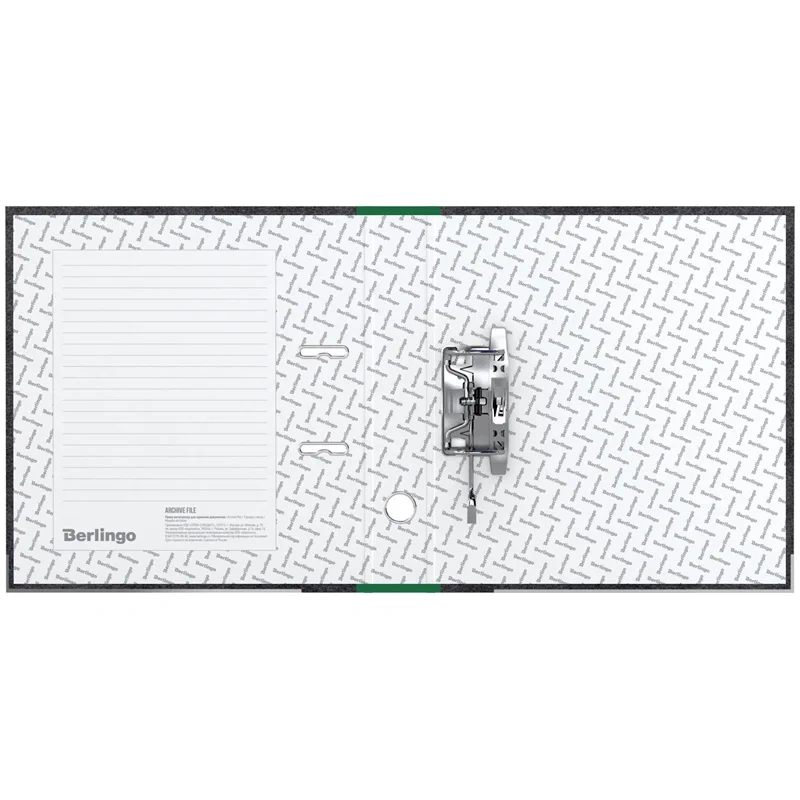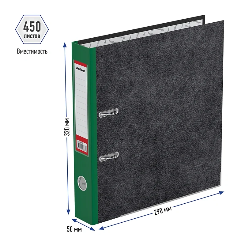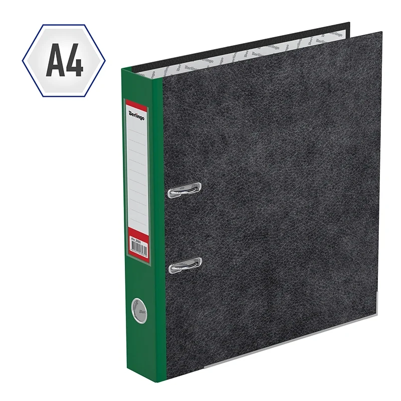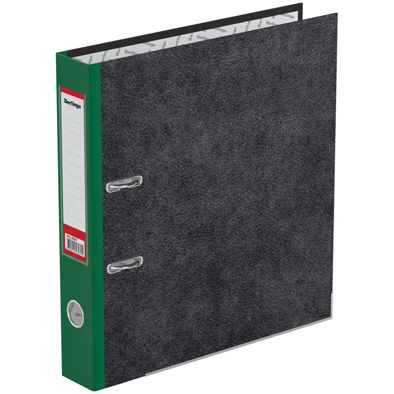 Папка-регистратор Berlingo серии Standard формата А4 с арочным механизмом идеальна для создания архива и экономии офисного пространства. Папка вмещает до 450 листов. Ширина корешка составляет 50 мм. Минималистичный и стильный дизайн: внешнее покрытие 'мрамор' чёрного цвета прекрасно сочетается с зелёным корешком, а на нижней грани есть металлическая окантовка. Изготовлена из жёсткого износостойкого картона. Папка имеет арочный механизм из качественного металла. Конструкция разработана с учётом всех особенностей эксплуатации. Эргономичное отверстие в корешке помогает быстро снять папку с полки. На корешке папки есть карман со сменным информационным ярлыком для маркировки. На внутренней стороне обложки папка-регистратор имеет поле для записи. Размер папки – 320*290*50 мм. Ориентация папки - вертикальная.