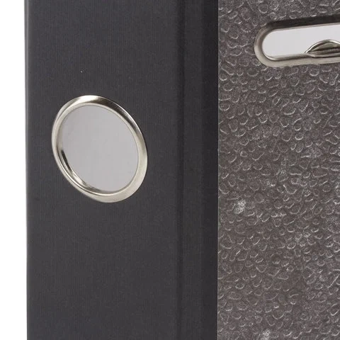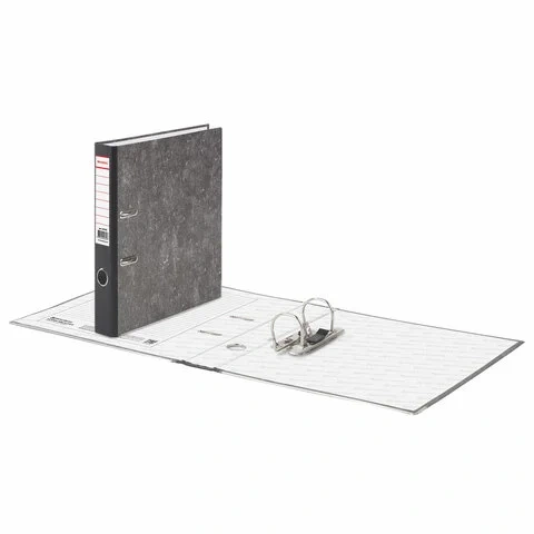 Папка формата А4 с вертикальной ориентацией изготовлена из высококачественного износоустойчивого картона с покрытием под 'мрамор'. Ширина корешка в 50 мм позволяет разместить до 350 листов. Нижние края папки защищены металлическими уголками, что увеличивает срок службы в 2 раза. Прорези для колец на внешней крышке позволяют оставаться папке закрытой даже при большом количестве бумаг, а надежный арочный механизм легко справляется с ежедневными нагрузками. Корешок снабжен этикеткой для маркировки содержимого, что позволяет структурировать информацию.