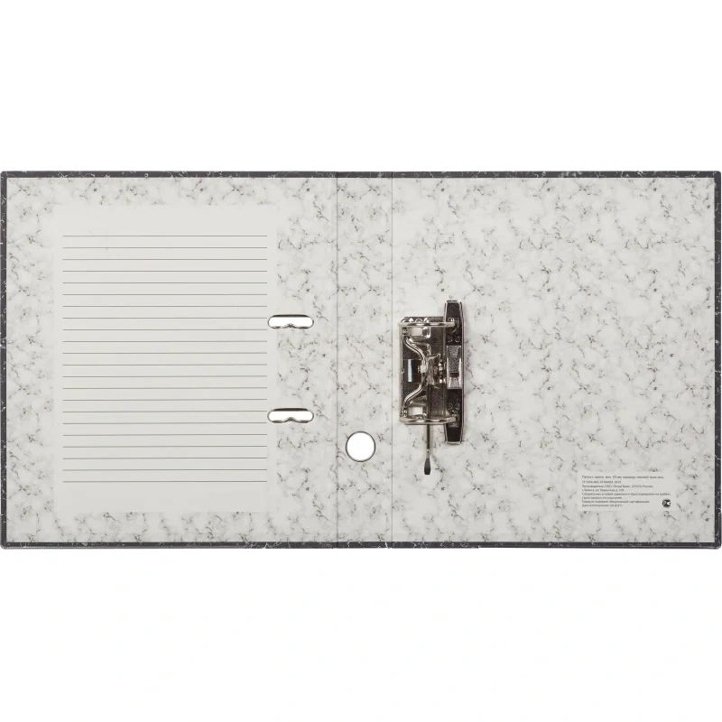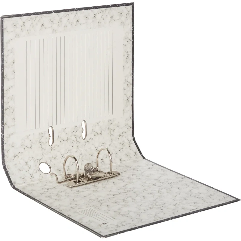 Папка-регистратор Attache изготовлена из плотного картона, с внешней стороны оклеена износостойкой бумагой, дизайн которой имитирует мрамор. Формат А4. Нижние края защищены металлическим кантом. Корешок черного цвета, ширина — 50 мм. На корешке есть кольцо для удобного захвата. Папка-регистратор вмещает до 350 листов стандартной плотности. Арочный механизм несъемный, произведен в Чехии. Специальные прорези на крышке не дают папке открываться при большом количестве вложенных документов. Предназначена для хранения и систематизации документов в офисах, государственных учреждениях, обеспечит порядок дома.