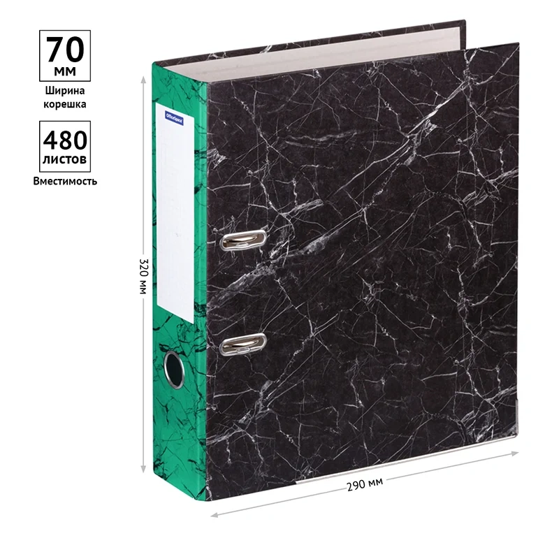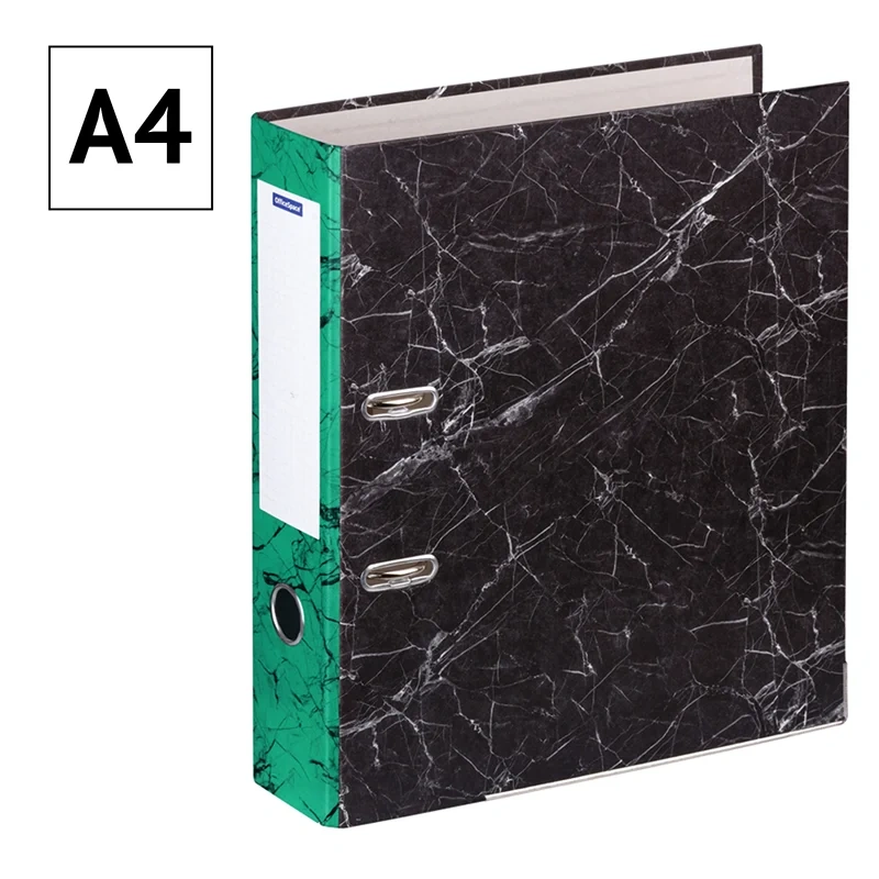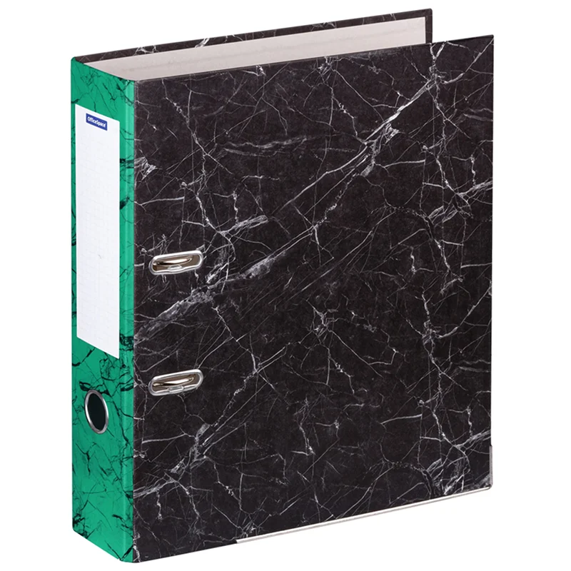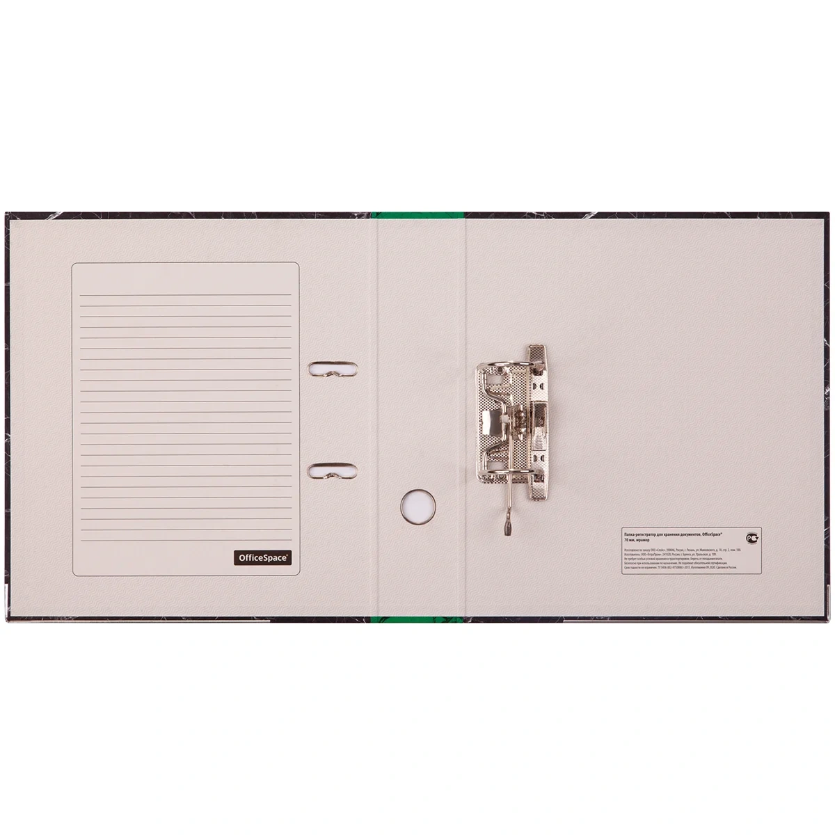 Папка-регистратор А4 Officespace черный мрамор, зеленый корешок, 70мм, с металлическим уголком