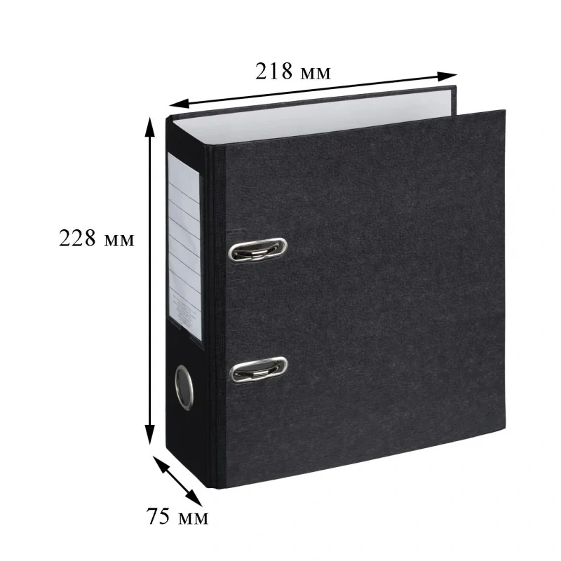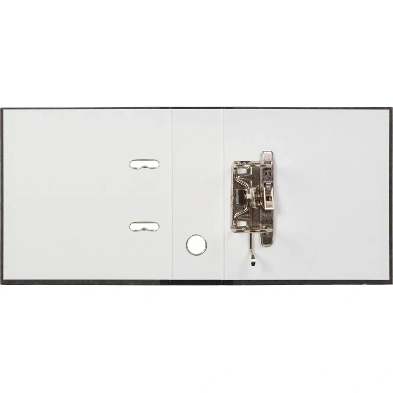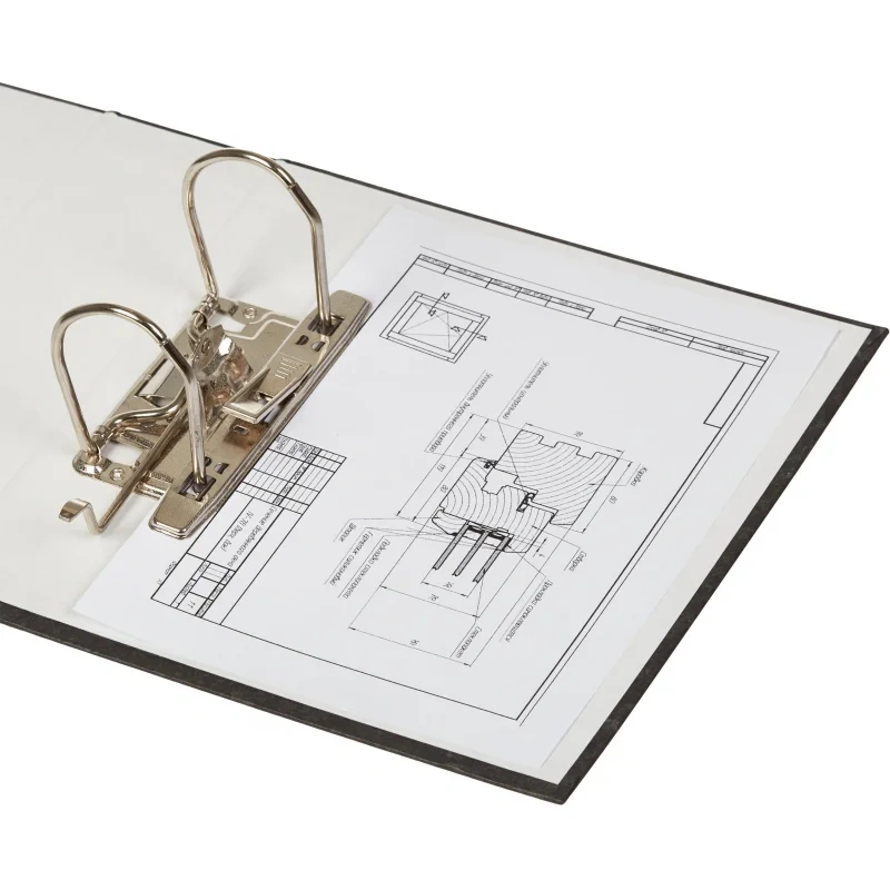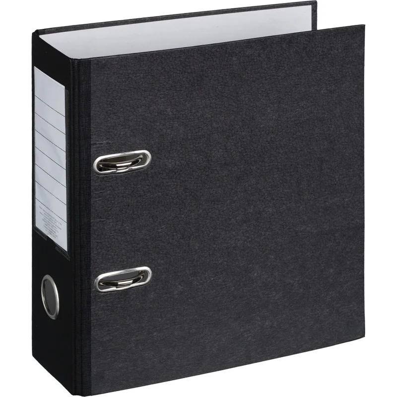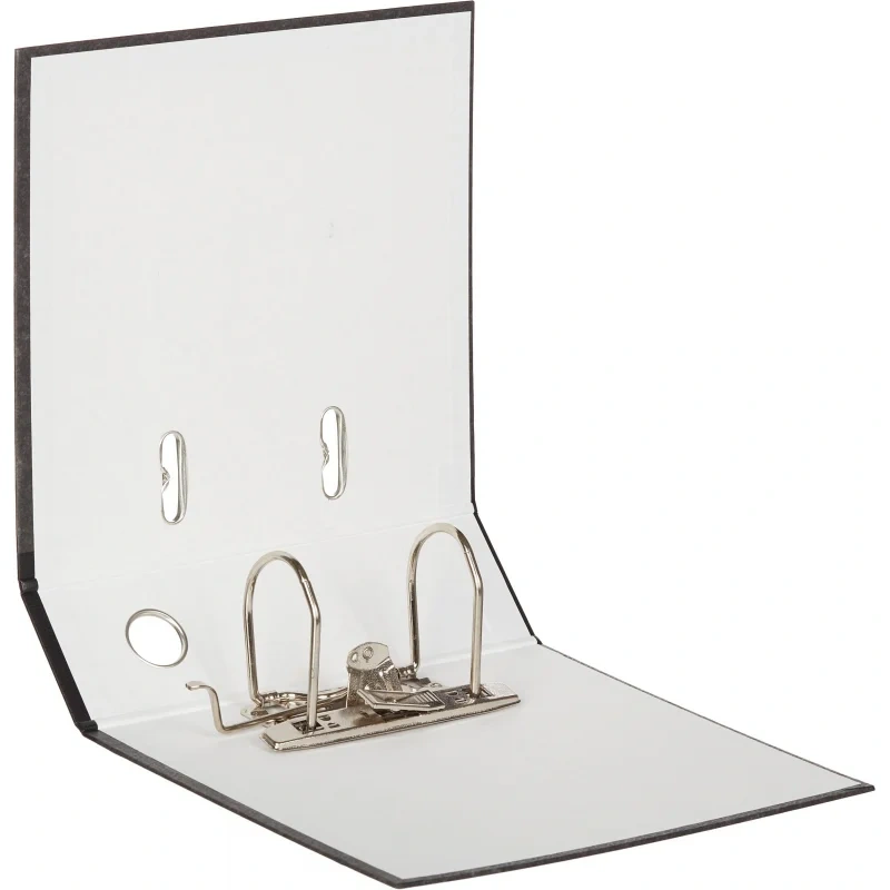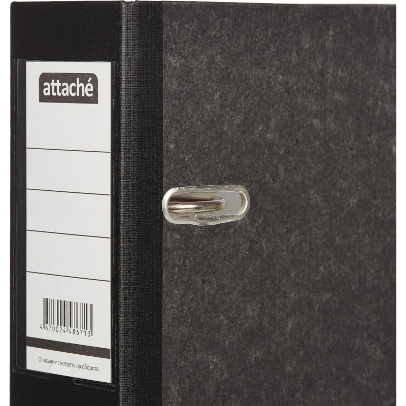 Папка-регистратор Attache с арочным механизмом изготовлена из плотного картона, покрытого фактурной бумагой под мрамор. Формат А5. Арочный механизм выполнен из особо прочной стали, произведен в Чехии. Специальные прорези на крышке удерживают папку закрытой даже при большом количестве документов. Корешок — бумвинил, ширина — 75 мм. Вместимость — 480 листов. Цвет — черный.