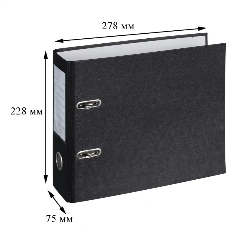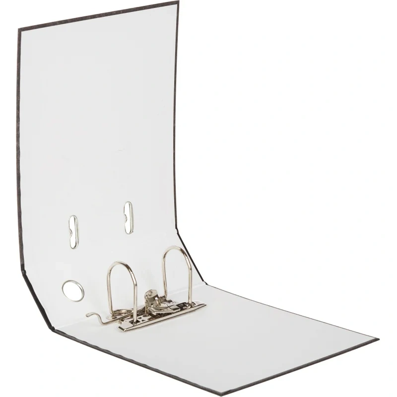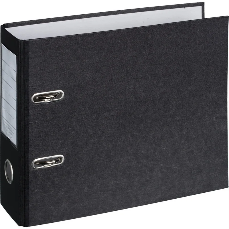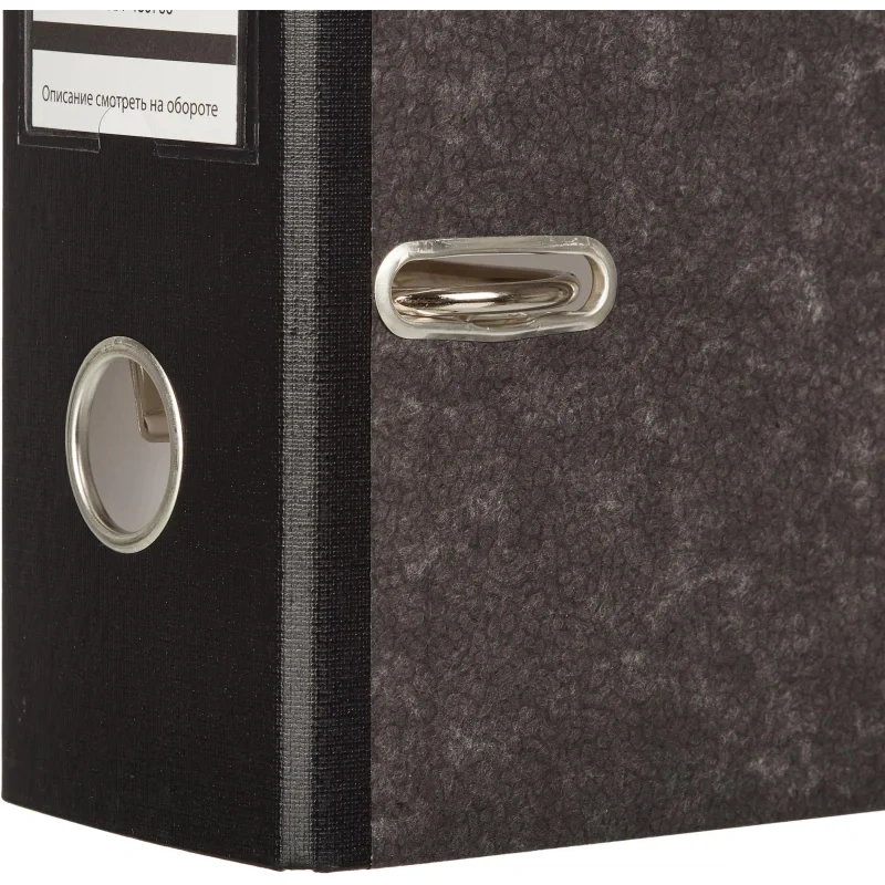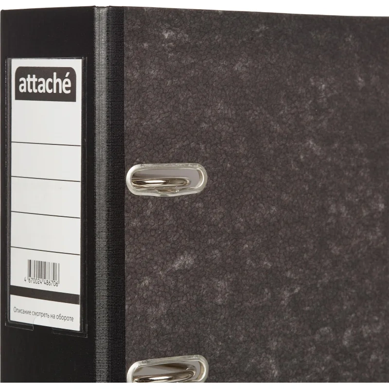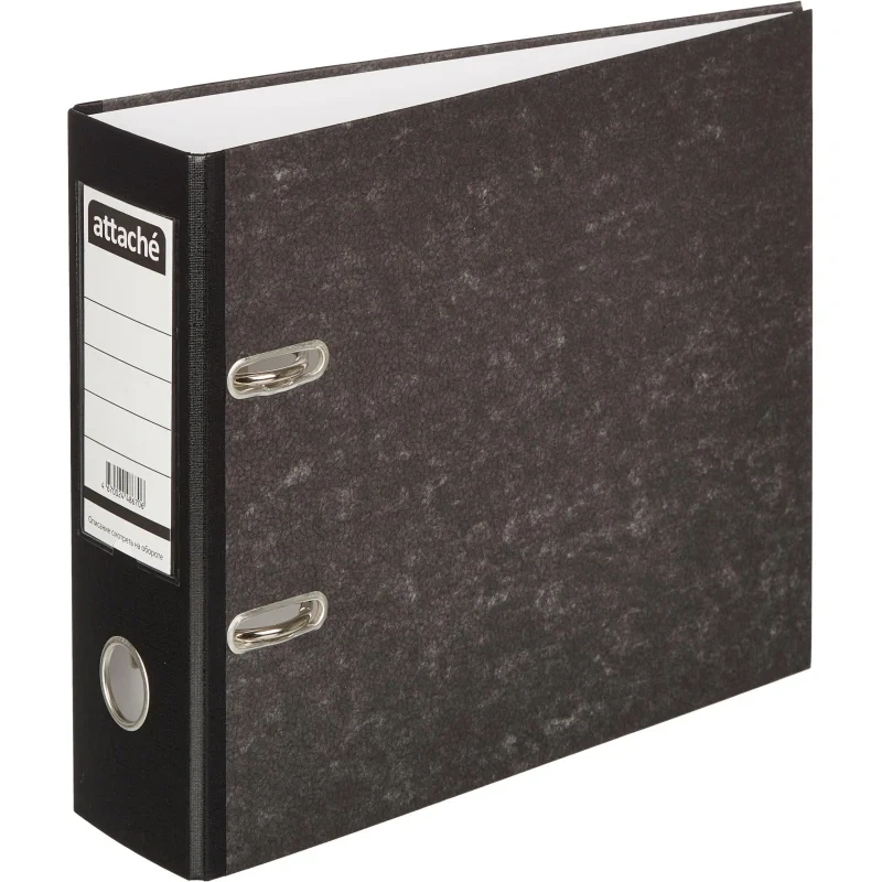Папка-регистратор Attache горизонтальная с арочным механизмом изготовлена из плотного картона. С внешней стороны оклеена прочной бумагой, дизайн которой имитирует мрамор. Формат А5, ориентация — горизонтальная. Арочный механизм выполнен из особо прочной стали, произведен в Чехии. Специальные прорези на крышке удерживают папку закрытой даже при большом количестве документов. Корешок — бумвинил, ширина — 75 мм. Вместимость — 480 листов. Цвет — черный.