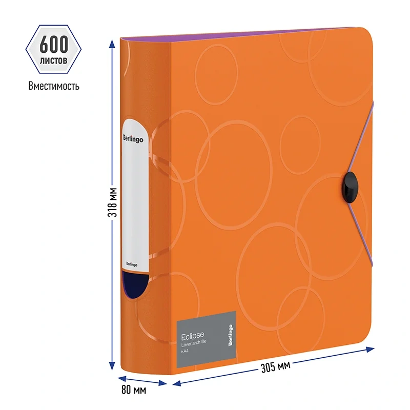 Стильная папка-регистратор Berlingo серии Eclipse формата А4 замечательно подойдет для хранения документов в офисе. Папка вмещает до 600 листов. Ширина круглого корешка составляет 80 мм. Изготовлена из полифома толщиной 2500 мкм. Внешняя сторона выполнена в насыщенном оранжевом цвете в сочетании с изящной фактурой в виде глянцевых пересекающихся окружностей. С ней контрастирует яркий фиолетовый цвет внутренней поверхности. Механизм фиксации папки в сложенном виде с помощью цветных резинок и стильной пластиковой застежки чёрного цвета. Специальная наклейка на корешке позволяет делать пометки о содержимом, также в комплекте есть дополнительная наклейка. Эргономичная полукруглая вырубка в корешке помогает быстро извлечь папку из хранилища. На внутренней стороне обложки папка-регистратор оснащена плотным прозрачным карманом для удобного хранения мелочей: ручки, заметок, визиток, дисков, флешек и др. Размер папки – 318*305*80 мм. Ориентация папки – вертикальная. Также папка имеет индивидуальный съёмный стикер с ШК и выходной информацией.• Вместимость, в листах: 600;• Формат: А4;• Цвет: оранжевый;• Ширина корешка: 80 мм