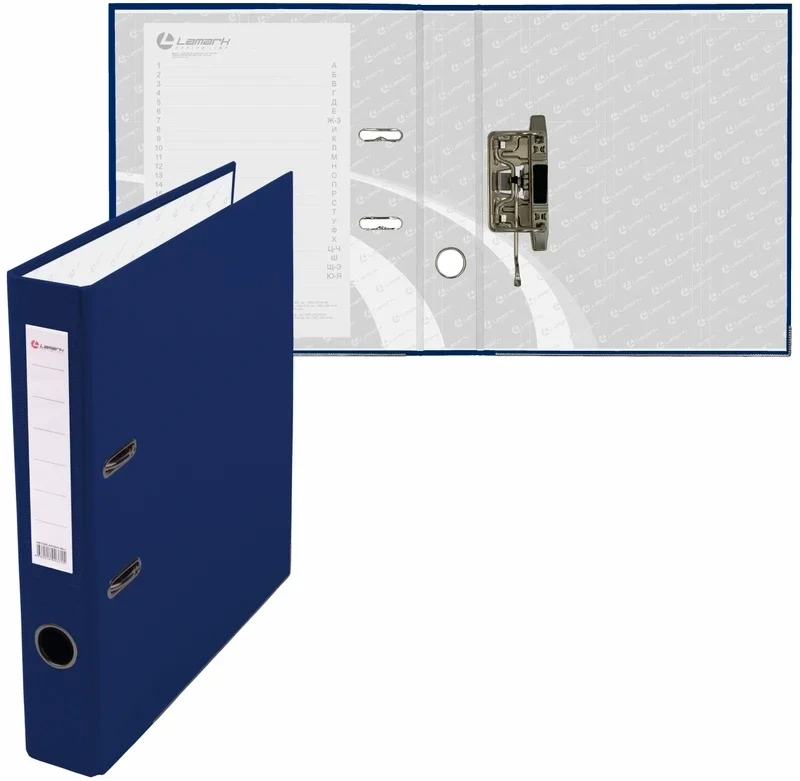 Папка-регистратор LAMARK РР с арочным механизмом изготовлена из плотного картона, с внешней стороны заламинированного полипропиленовой пленкой (РР) с текстурой 'лен', внутри оклеена бумагой с алфавитно-цифровым полем для классификации на левой стороне. Прорези на крышке удерживают папку закрытой даже при большом количестве документов. Ширина корешка 50 мм. Вместимость до 300 листов формата А4. Нижние края защищены металлическим кантом, что сохраняет папку при длительной интенсивной эксплуатации. Карман со сменной индексной вставкой на корешке. Цвет синий. Поставляются в собранном виде.