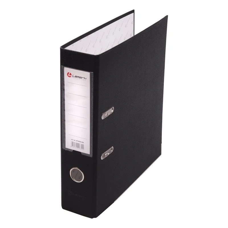 Папка-регистратор LAMARK РР с арочным механизмом изготовлена из плотного картона, с внешней стороны заламинированного полипропиленовой пленкой (РР) с текстурой 'лен', внутри оклеена бумагой с алфавитно-цифровым полем для классификации на левой стороне. Прорези на крышке удерживают папку закрытой даже при большом количестве документов. Ширина корешка 80 мм. Вместимость до 480 листов формата А4. Нижние края защищены металлическим кантом, что сохраняет папку при длительной интенсивной эксплуатации. Карман со сменной индексной вставкой на корешке. Цвет черный. Поставляются в собранном виде.