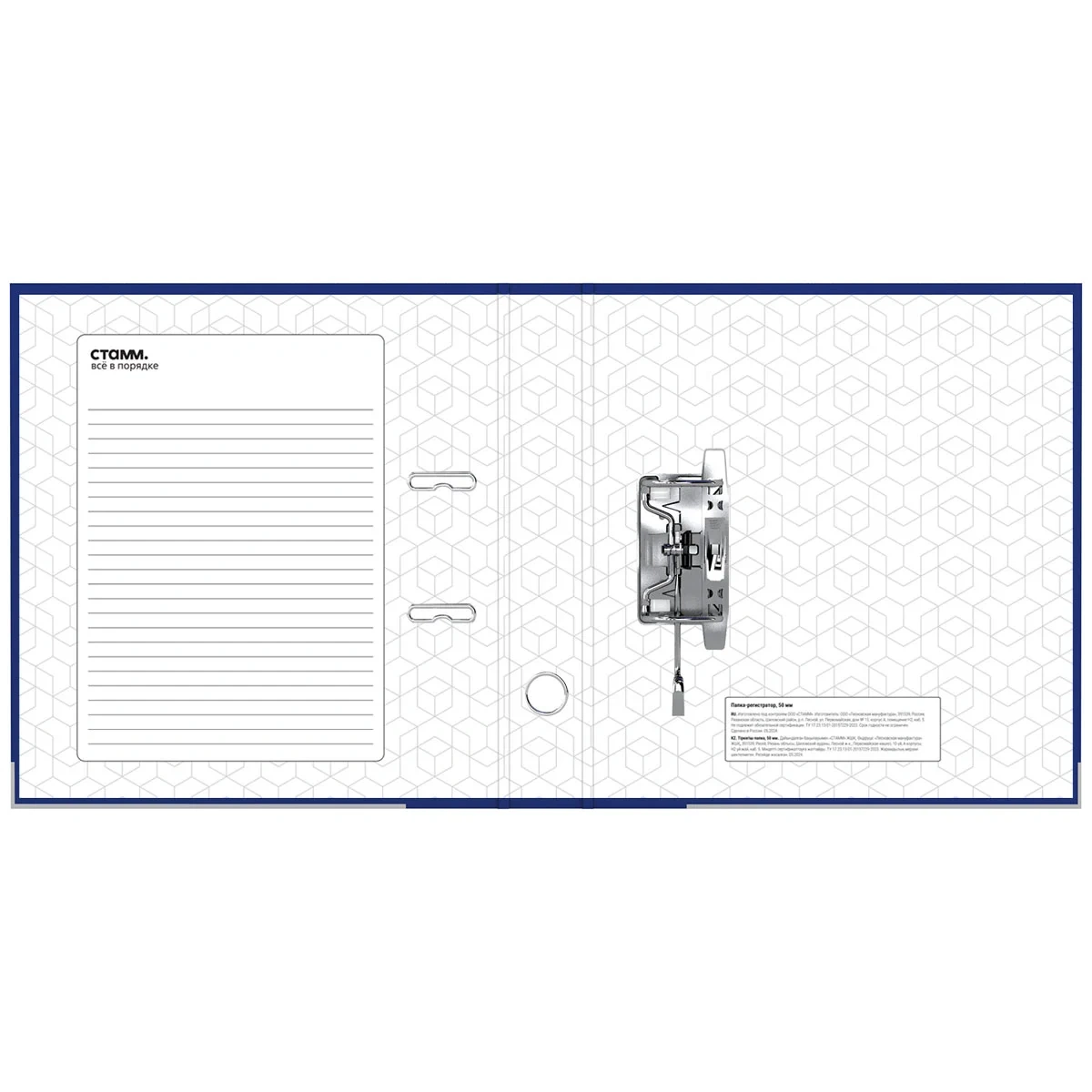 Папка-регистратор Стамм серии 'Бизнес' формата А4 с арочным механизмом эффективно экономит офисное пространство и идеальна для создания архива. Папка вмещает до 450 листов.Ширина корешка составляет 50 мм. Минималистичный классический дизайн: папка выполнена в глубоком синем цвете. Изготовлена из жесткого износостойкого картона с односторонним покрытием из бумвинила. Нижние грани укреплены металлическим кантом. Внутреннее покрытие - бумага. Папка имеет арочный механизм из качественного металла. Конструкция разработана с учетом всех особенностей эксплуатации. Эргономичное отверстие в корешке помогает быстро снять папку с полки. На корешке папки есть карман со сменным информационным ярлыком для маркировки. На внутренней стороне обложки папка-регистратор имеет поле для записи. Размер папки – 320*290*50 мм. Ориентация папки - вертикальная.